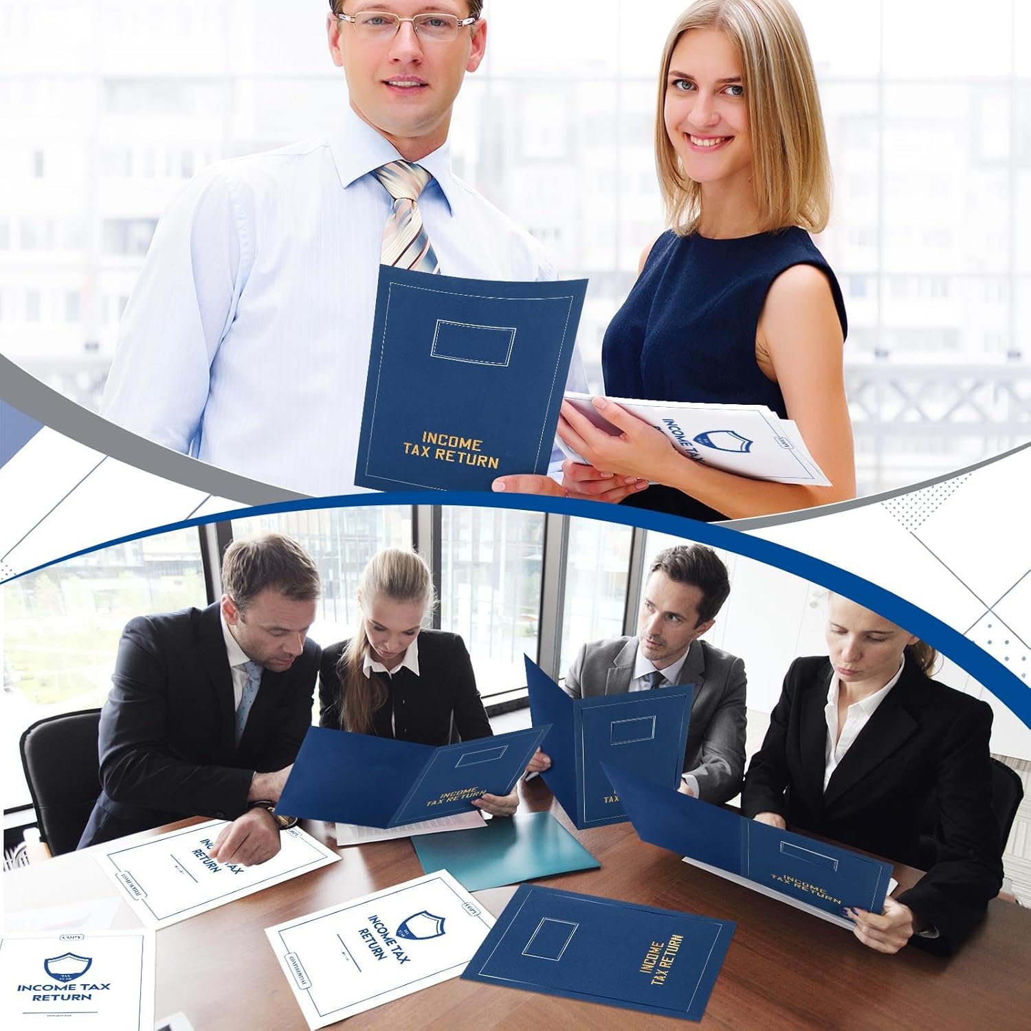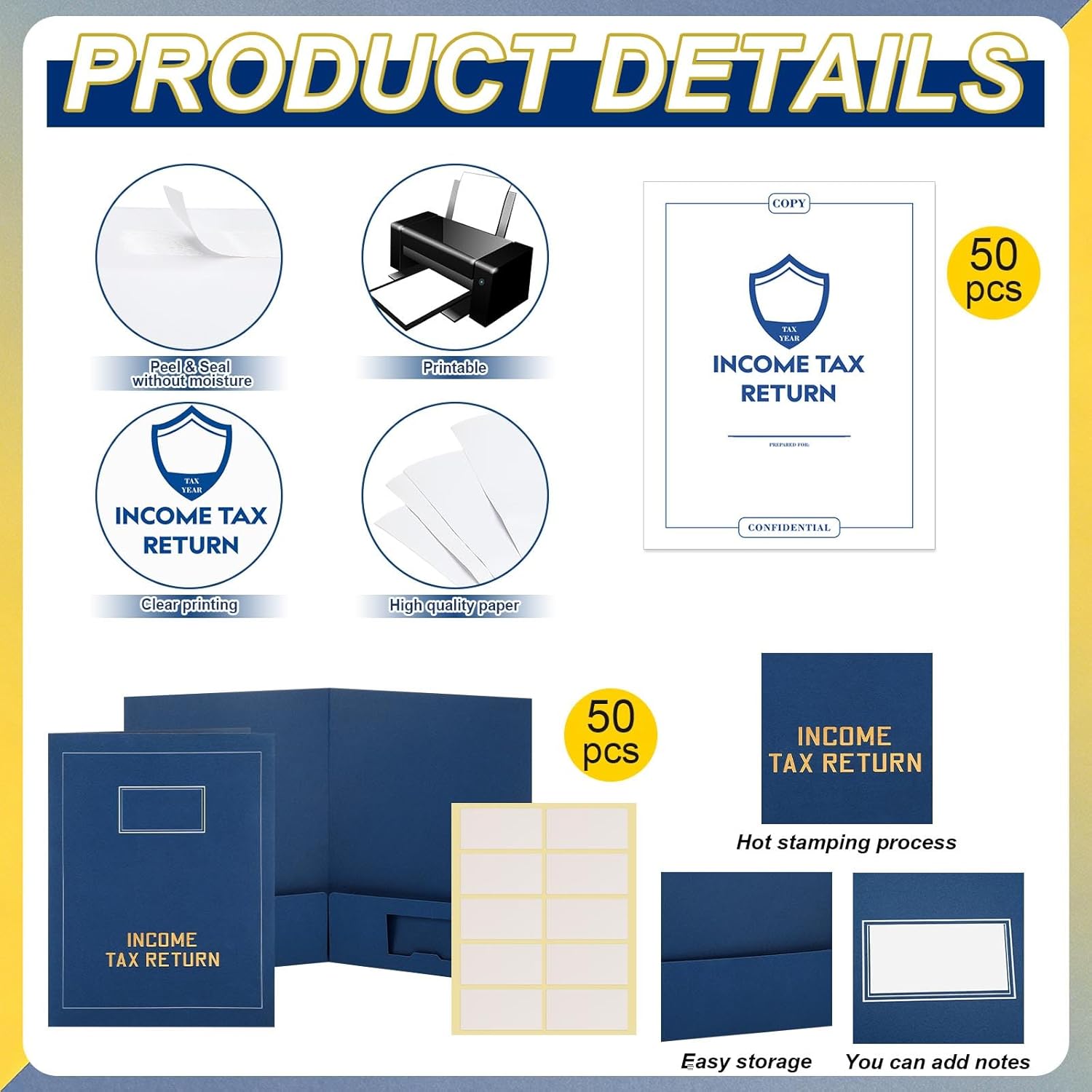 Features: Multi-pocket clear partitioning for easy categorization of receipts and documents: Each income tax return folder has two independent pockets to support the categorization of receipts, tax forms, vouchers, etc., avoiding confusion and ensuring easy access. Flexible package options for both personal use and bulk distribution: 50 Sets of income tax return folders in uniform packaging meet the year-round organization needs of individual users and facilitate centralized procurement by businesses for internal use or external presentation. Specifications: Material: paper Color: blue, white, gold Size: Income tax return folders with pockets: is about 9.45 x 12.6 inches/ 24 x 32 cm White income tax return open envelopes: is about 9.06 x 11.81 inches/ 23 x 30 cm Labels: is about 1.97 x 3.54 inches/ 5 x 9 cm Package includes: 50 x Income tax return folders with pockets 50 x White income tax return open envelopes 50 x Labels Notes: Manual measurement, please allow slight errors on size. The color may exist a slight difference due to different screen displays