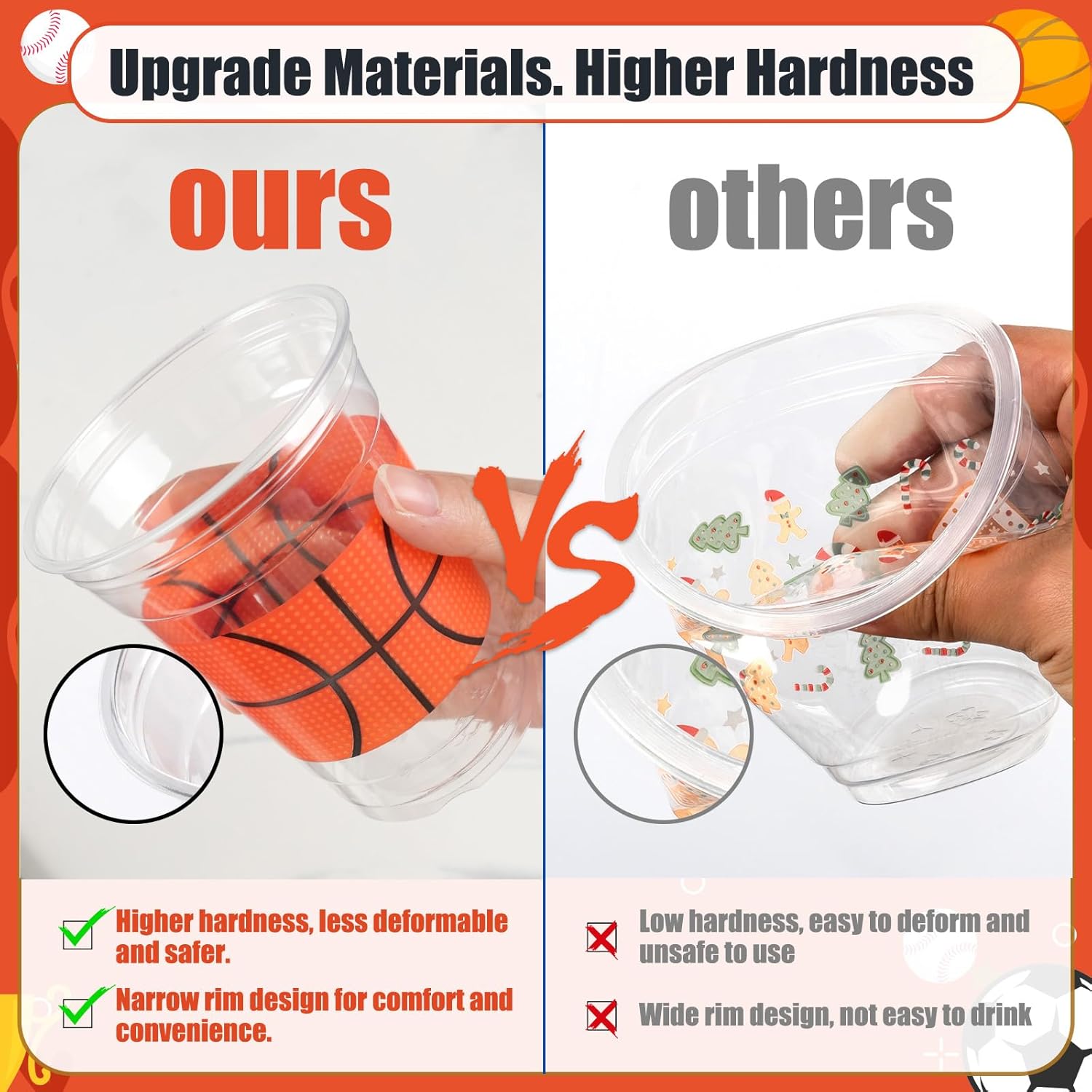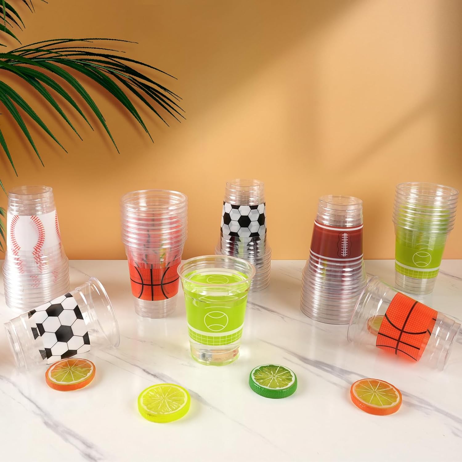 Score big at your next party with these 100PCS 12oz plastic sports cups Designed for sports birthday parties decorations, football parties, and game-day celebrations, these vibrant sports cups feature 5 unique designs inspired by football, basketball, soccer, and baseball, making them the perfect addition to your sports party decorations. Made from durable plastic, these sports party cups are sturdy enough to hold both hot and cold drinks, from sodas and juice to cocktails. Their sports theme design also makes them great for serving snacks like popcorn and candy. Perfect sports cups for adults, offer a quick and easy cleanup—simply dispose of them after use and keep the party going!