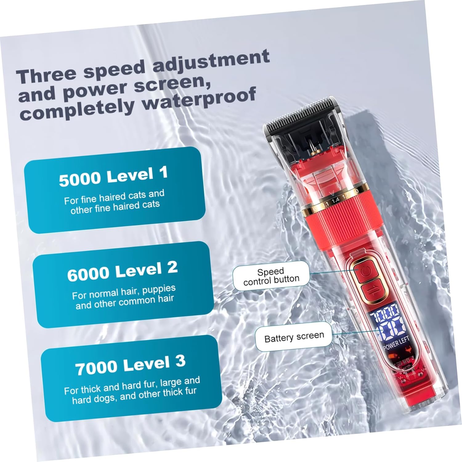Package Include 1 x clipper 4 x guide 1 1 x charging cable 1 1 x nail clipper 1 1 1 x instruction Features - Size: 18.00X4.50X4.00cm/7.07X1.77X1.57in pet grooming device -Charging time: about 2.5 hours dog grooming clipper - Comprehensive kit: This grooming and trimming kit comes with multiple accessories, suitable for dogs, cats or other furry friends dog grooming clippers. - screen: The screen on this clipper handle can show you the battery status, speeds, charging reminder, bring you much convenience dog clippers cordless. - : 5W dog grooming tools -Material:ABS, metal clipper for dog grooming - Color: Red electric dog trimmer -Working time: about 90 minutes clippers for cats - Washable: The whole body of this pet clipper can be washed with water after use, easy and time-saving pet grooming clippers. -Battery capacity: 1200mAh dog trimmer - Low noise: This pet clipper produces low noise when in use, making your pets less frightened and your work easier pet clipper. - Easy to use: You can use different guide and speeds according to the length and toughness of your pets pet trimmer.Goods Descriptionlow noise dog grooming Our pet grooming clipper is suitable for both dogs and cats.pet removal tool This clipper will make your pet grooming easier!.cordless dog clippers Our clipper features its low noise, three speed modes and clear screen.clipper for dog grooming If you are looking reliable and convenient pet grooming clipper, then this product can meet your needs