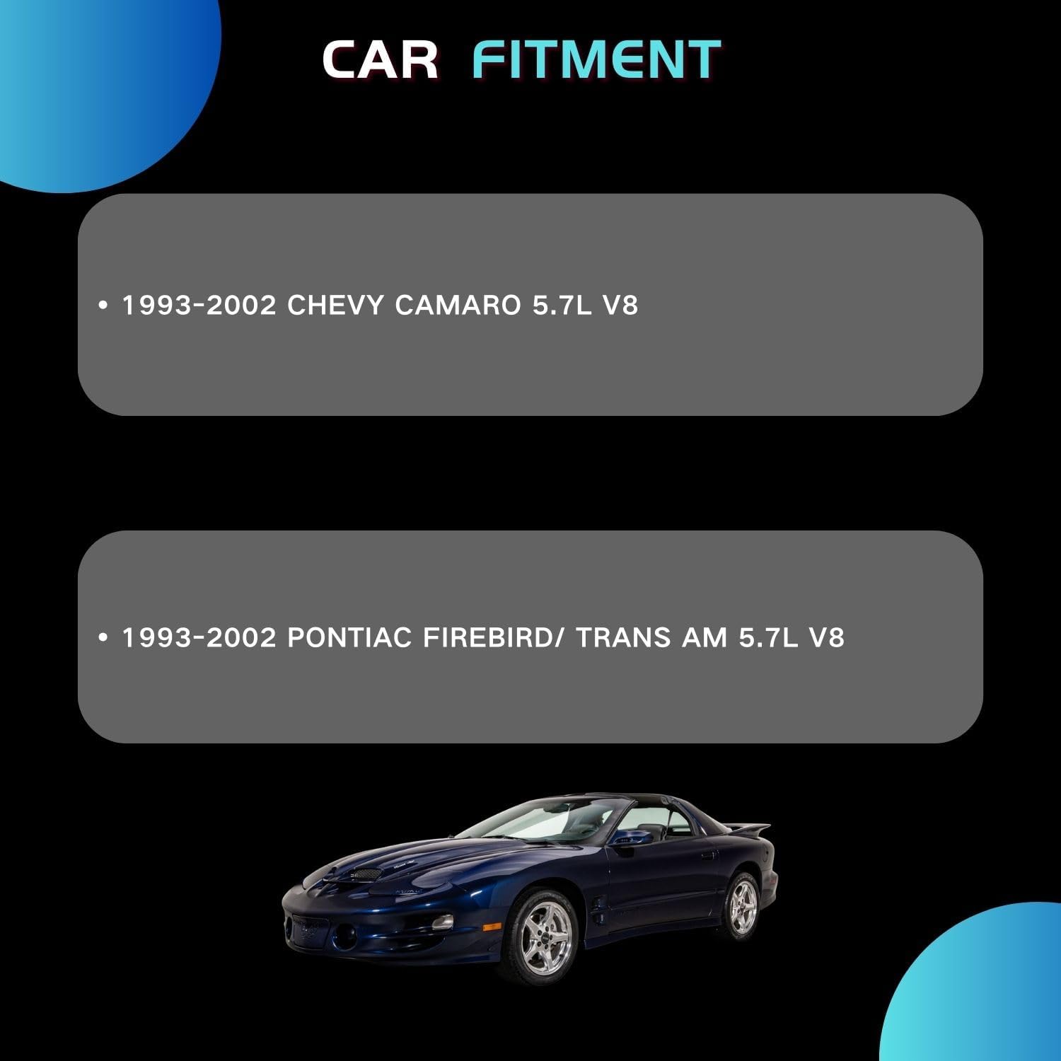 This Listing Is Including: 1 X 3-Row AA5052 Aluminum Radiator 1 X CNC Machined Radiator Cap 1 X AA5052 Aluminum Shroud 1 X 16" Fans (Includes mounting kits) 1 X Thermostat Relay Kit Radiator Size: Condition:New High Performance Racing Spec. 3-Row of tubes Core Racing Design Petcock Drain:OEM style brass petcock drain CNC machined filler neck and cap Radiator Flow: CROSS FLOW Core Dimension (H x W): 17 3/4'' x 25'' x 2'' Overall Dimension (H x W): 20 1/2'' x 29 5/8'' Hose Locations: IN: 1 1/4'' Passenger / OUT: 1 3/8'' Driver Trans Cooler: YES Mounting Type: PIN MOUNT FAN DESCRIPTION: Size: 16" Volts: 12 V Watts: 120 w Number of Fan Blades: 10 Maximum Fan FAN CFM>=1000 CFM Maximum Fan RPM=2000±10% RPM OE Fitment or Replacement, Push or Pull Type Easy direct installation, require NO modification Thermostat Kit: Universal fit for any automotive vehicle and electric fan. Activates by grounding electric fans at preset temperature. 180'F turn-on temperature, 165'F turn-off temperature. RED + connect directly to battery. WHITE wire to ignition switch power source. BLACK goes to thermos switch. BLUE wire goes to the Fans. This set up will run Fans & pull air in through radiator. Vehicle Fitment: For 1993-2002 CHEVY CAMARO 5.7L V8 For 1993-2002 PONTIAC FIREBIRD/ TRANS AM 5.7L V8