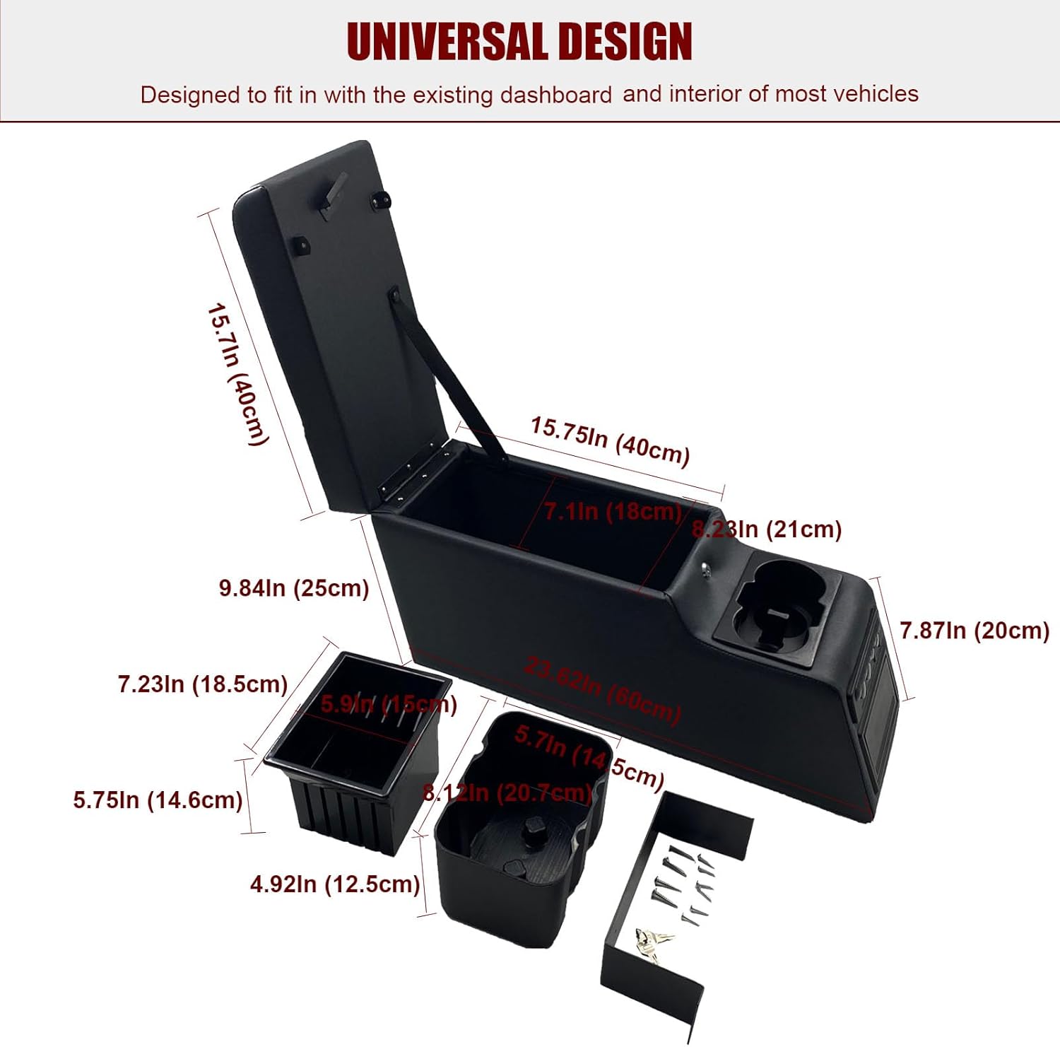 Universal Truck Seat Center Console Whether it's a pair of sunglasses,a cell phone,or loose change,keep everything organized with this Universal Truck Seat Center Console.There's plenty of space for all your storage needs,Smaller objects or items can also be properly kept in built-in organizer strays for easy access. Select consoles come with or without lockable storage areas(for small valuables) and can also be used as a wriring area, an arm rest or a cup holder for drinks Interior features a massive open space with removeable organizational insert to keep smaller items separate and handy Carpeted bottom to protect upholstry with seat belt anchor strap to keep it in place.The console has a heavy-duty barrel hinge lid Keep your interior clutter-free and your business