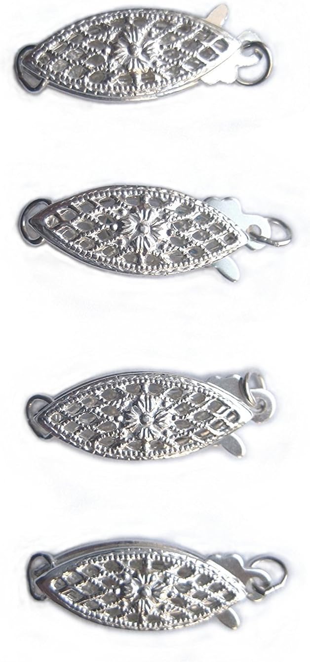 The .925 sterling silver large oval filigree pearl multi-strand clasp is 6 mm tall and 16 mm wide. Sold in packages of 4, it is a stunning end to multi-strand necklaces and bracelets.