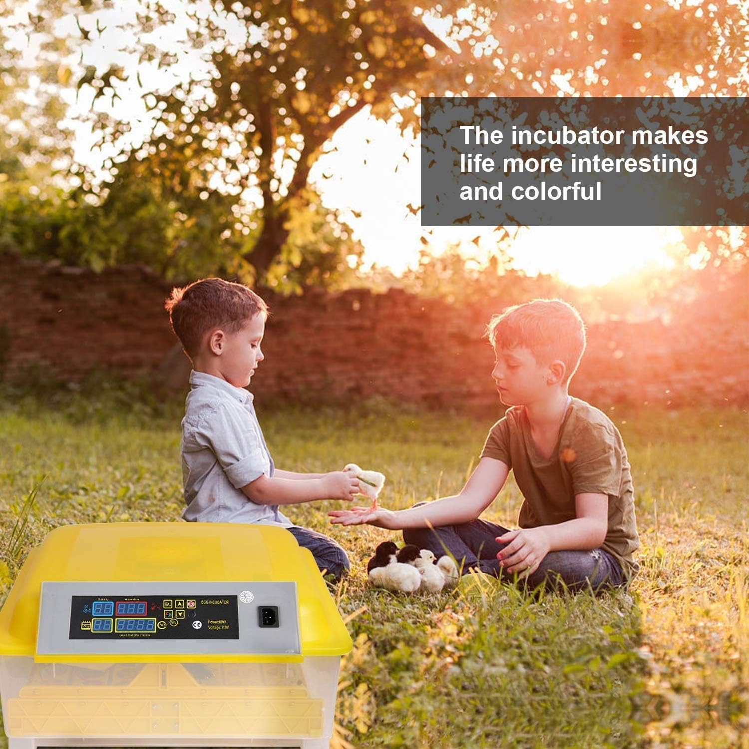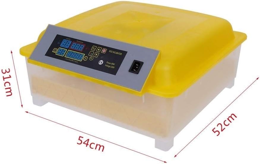 Specifications: Color: Yellow & Transparent Weight: 5 kgDimensions: (19.49 x 18.5 x 9.06)" (L x W x H) Hatching Eggs Storing Temperature/Humidity Range: 20℃ ~ 40℃ Voltage: 110v/220V Frequency: 50~60Hz Power: 80W Incubation Quantity: 48Pcs Suitable for: Chickens, Ducks, Geese and Other Poultry, Quail, Parrot, Pigeons and Other BirdsFeatures:--superior material and delicate workmanship --Durable and safe to use --Allow 48pcs eggs to put in --Good heat preservation and energy-saving performance --Support automatic egg turning --Convenient temperature control for instant grasp or adjustment of inner temperature --High accuracy and good stability --easy operationPackage List: 1 x Incubator1 x Power Cable1 x User Manual