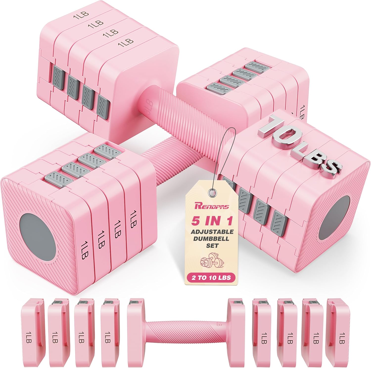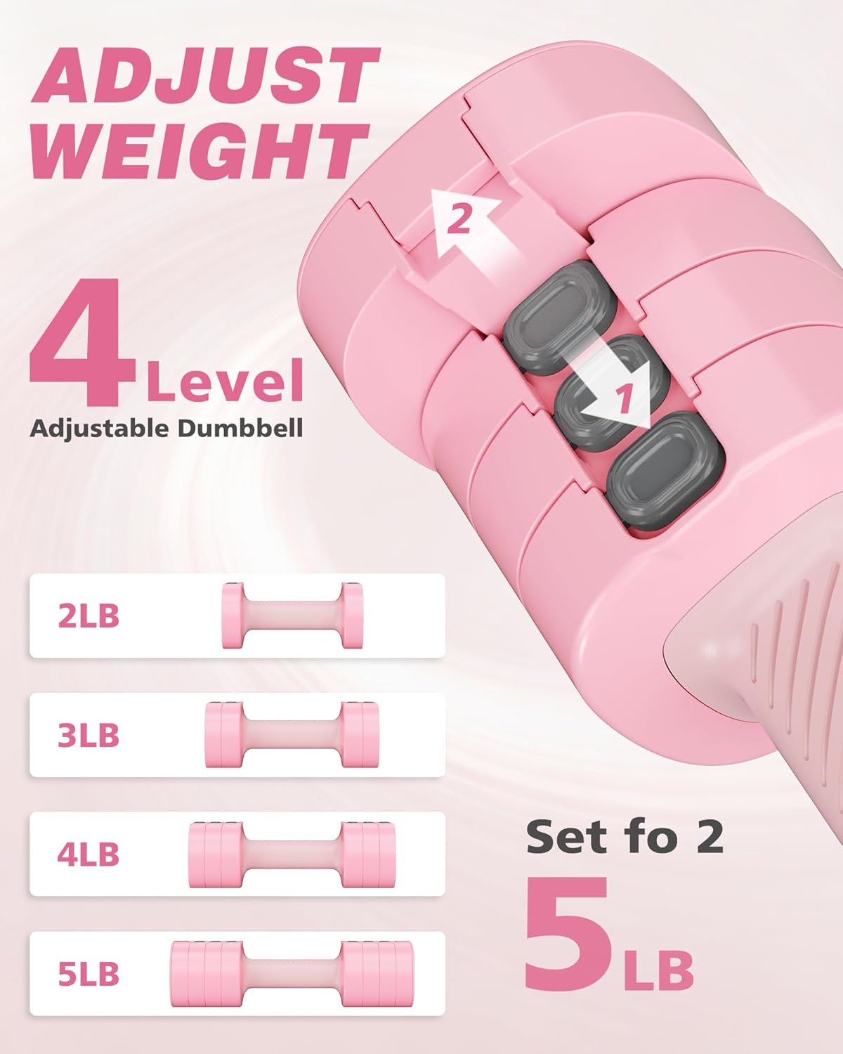 Quick-Change Adjustable Dumbbells for Consistent, Small-Space WorkWhyIf you’re training in a small room, following video routines, or running circuits, stopping to swap multiple pairs can break rhythm and clutter your space. You need a light-to-moderate load range that’s easy to progress without a full rack.HowThis adjustable pair features a quick-change system with about a 1-second changeover, so you can keep sets moving. The dual-lock design helps keep plates secured during controlled reps, and the no-roll shape helps prevent drifting when placed down between sets.Who It’s ForGreat for:Beginners building consistency with light-to-moderate resistancePeople following guided routines such as circuits, supersets, or tempo workApartment or limited storage spaces; anyone who prefers a tidy setupGeneral strength training including arms, shoulders, and core accessory movements with controlled repsNot recommended for:High-impact or drop-style training such as throwing, slamming, or letting weights fallCommercial or continuous heavy-use environmentsChildren or anyone unable to complete lock-check steps independentlyBefore You LiftPlace the dumbbell on a flat, stable surface before selecting a weight.Adjust only when fully supported. Do not change weight while holding it in the air.After selecting, confirm both sides are fully locked before lifting, pressing, or carrying.Perform a quick inspection before use. If anything feels loose or appears damaged, do not use.Use controlled reps and set down gently. Avoid impacts.Training LoopSelect your target load on a stable surface.Check both sides are fully locked before the first rep.Perform your set with controlled movement and stable wrist alignment.Place the dumbbell down between sets. The no-roll shape helps it stay in place.Increase to the next increment as needed for progression.Store in a dry area after use and keep away from children and pets.SpecificationsProduct Type: Adjustable dumbbell pairQuantity: Set of 2Weight Options (5lb Model): 2 / 3 / 4 / 5 lb per dumbbellWeight Options (10lb Model): 2 / 4 / 6 / 8 / 10 lb per dumbbellAdjustment Time: About 1 second (user operation)Locking System: Dual-lock designShape: No-rollDimensions (5lb Model): Approx. 11.81 x 2.95 x 3.15 inchesDimensions (10lb Model): Approx. 14.17 x 3.54 x 3.54 inchesFootprint: Less than 2 square feetGrip: Non-slip handleFAQHow do I change the load safely? Place the dumbbell on a flat surface, select the target weight, and confirm both sides are fully locked before lifting.Can I use these for overhead movements? Yes for controlled overhead presses after completing a lock-check.Are these suitable for dropping? No. Designed for controlled reps and gentle set-downs only.What if I feel wobble or looseness? Stop immediately, reset the weight, and re-check both locks before continuing.