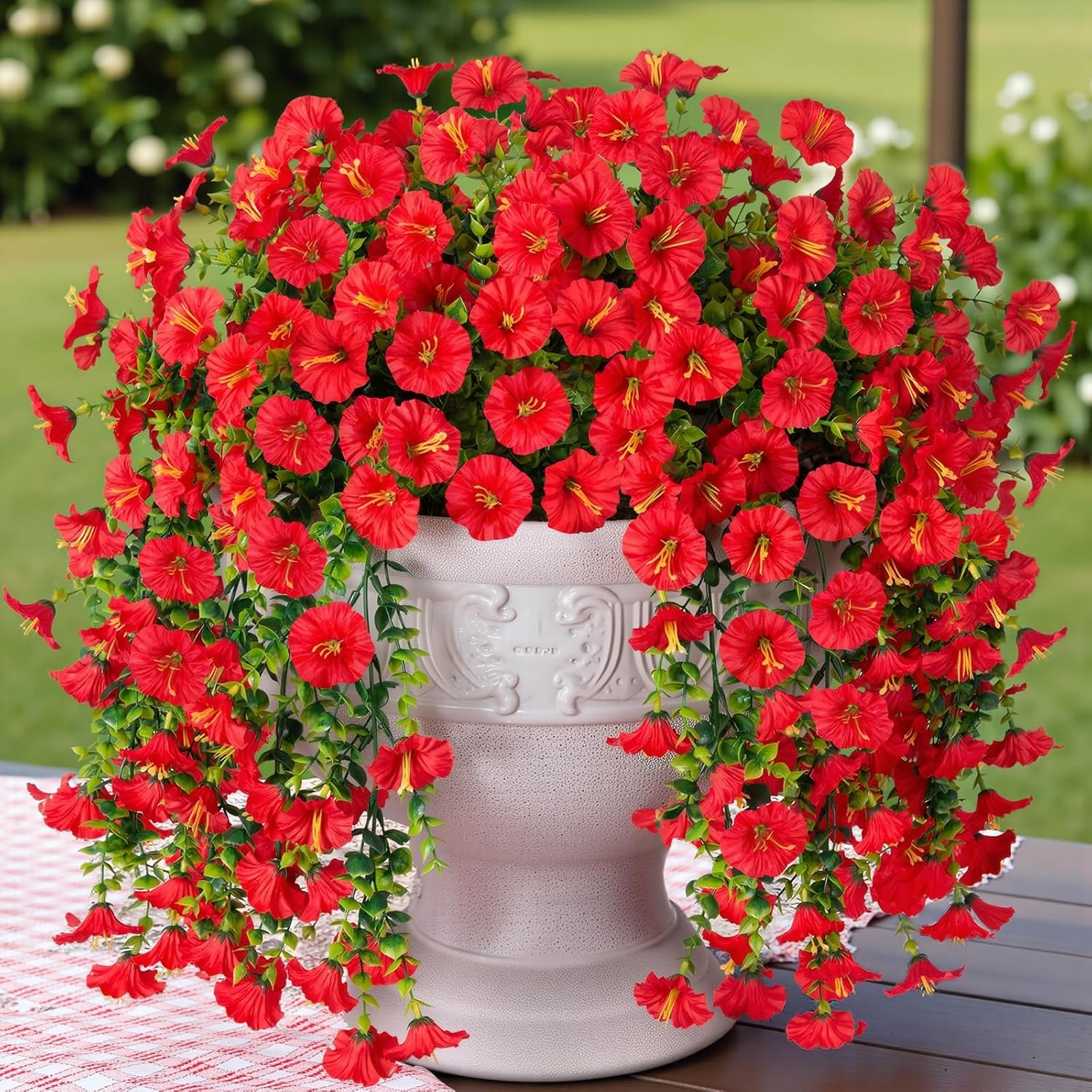 Why You Should Buy Artificial Flowers?Fake flowers are more economical and easier to maintain than their real counterparts. You can easily spruce up your patio with these artificial flower plants that'll have you thinking of summer all year long.Adjustable: Removable flowers and bendable stems make it easy to adjust to your desired looks.Warm Tips:1. Due to the airtight packaging, the flowers may have a slight smell, please keep them in a ventilated place for 1-2 days. The smell will disappear.2:When transporting, each bouquet is placed close together to reduce space, you can Tidy up artificial flower branches and flowers, tune them to the most natural state, and decorate them wherever you want.3.Due to the light and screen setting difference, the color of item may be slightly different from the pics.