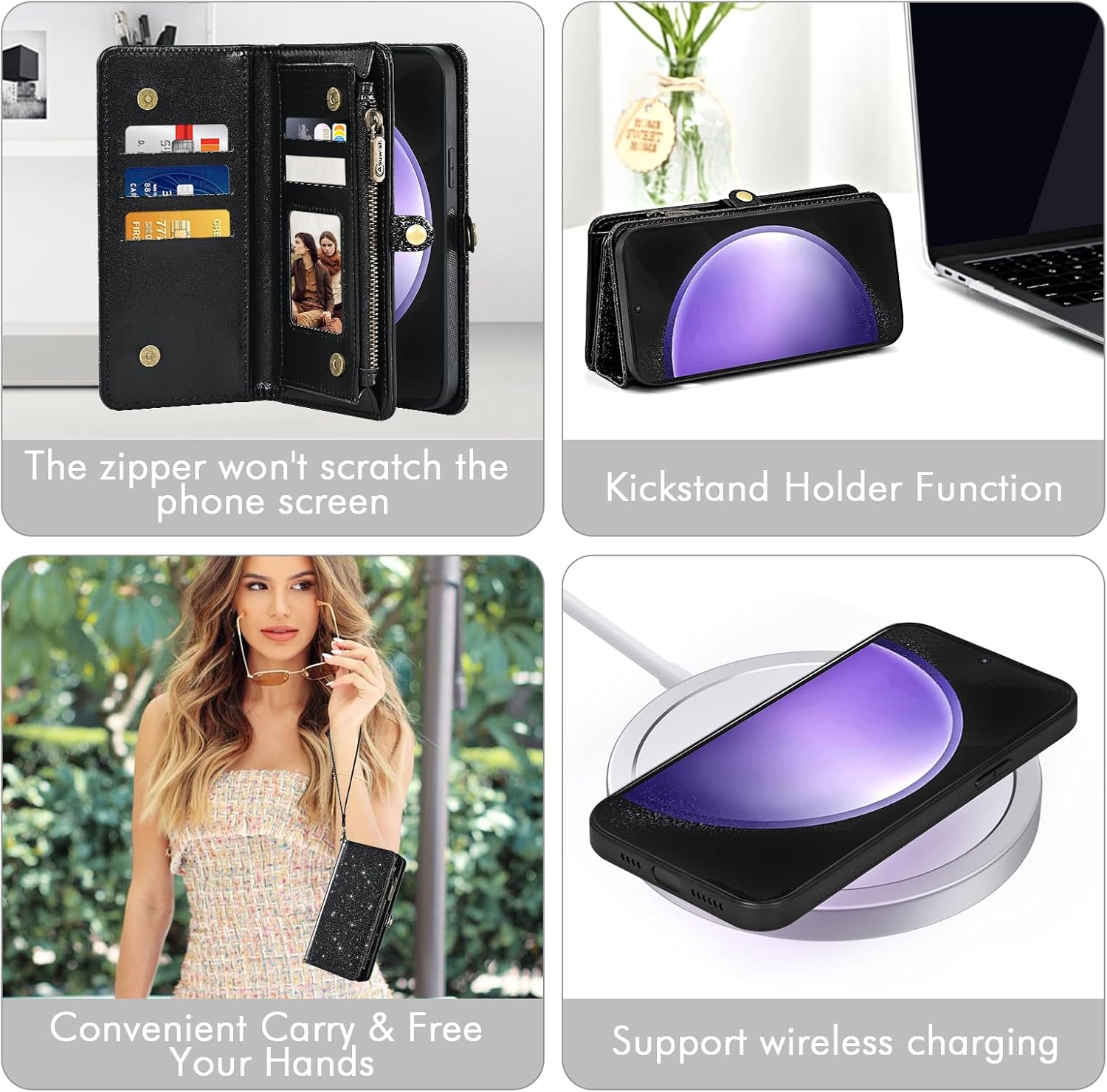 【Compatible Models】: Compatible with Samsung Galaxy S23 FE, NOT compatible with S23 and other devices.【Package includes】: We will send the phone case with 1 piece tempered glass screen protector + 1 detachable wrist strap + 1 detachable crossbody strap.【Support Detachable & Wireless Charging】: You could use the removable back cover as a simple protective back cover alone,it work with wireless charging,no need take off the case before you go wireless charging.