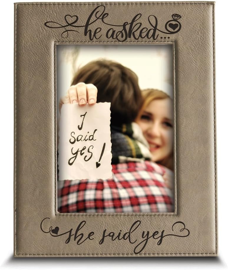 ❤️He asked and you said yes! Show off this special moment with our Engraved Engagement Frame. Capture the unforgettable moment of your engagement with this elegant picture frame, engraved with the heartfelt words, "He Asked... She Said YES!". The design includes two hearts intertwined at the bottom, symbolizing the bond of love and commitment. the frame accommodates a 4x6 or 5x7 photo, making it perfect for displaying that cherished memory on a desk, mantel, or wall. A beautiful keepsake for celebrating one of life's most joyful occasions!