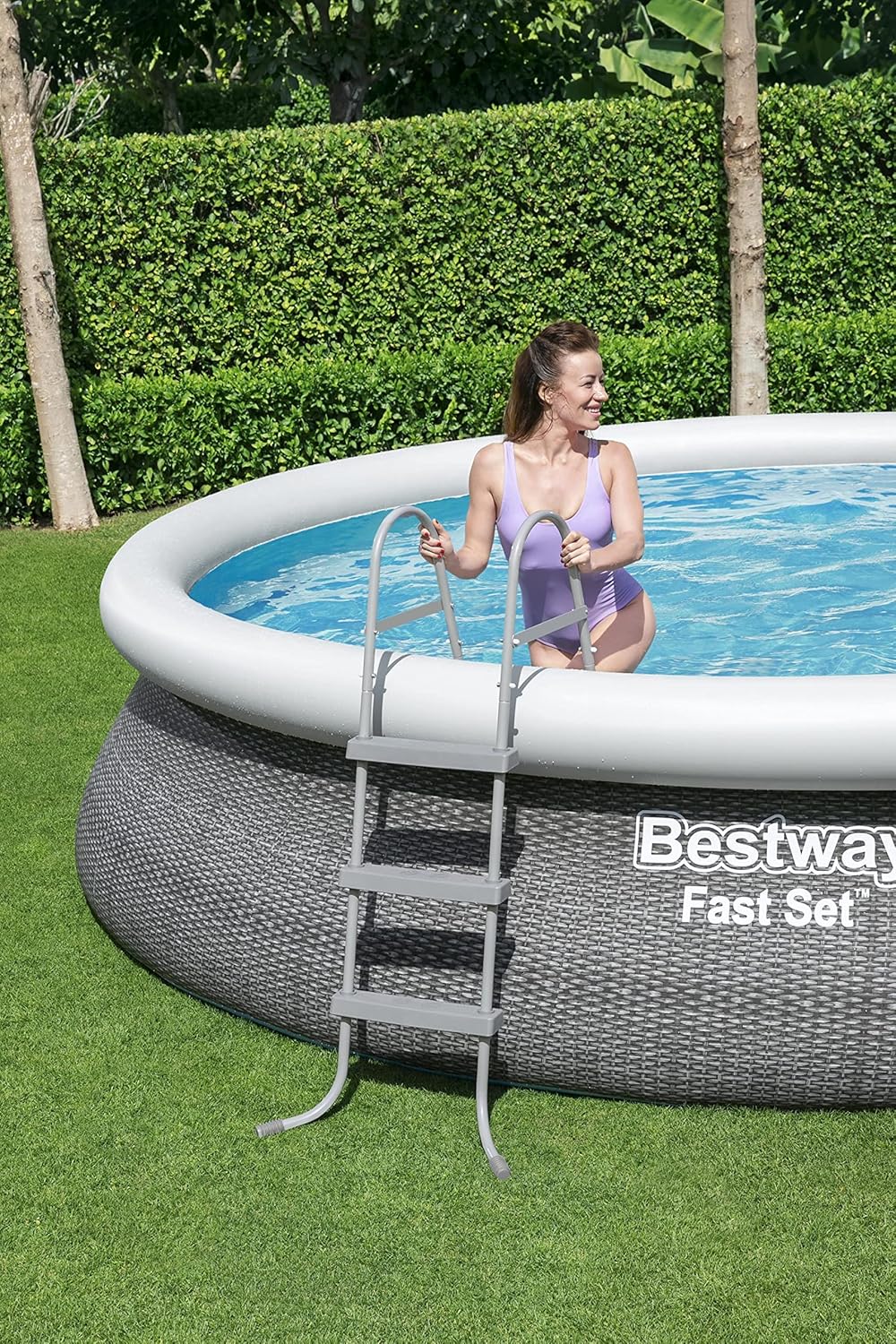 With this quick and easy Bestway® Fast Set™ Pool Set, you’ll be ready for a pool day in no time! The Fill & Rise set-up process is simple - just select a level surface, inflate the top ring and the pool will rise as it’s filled up with water. The sturdy DuraPlus™ liner is made out of an ultra-durable 3-layer material that is reinforced for strength and is 85% more puncture-resistant than PVC. The attractive liner also features a realistic rattan print that will bring a classy look and feel to your backyard. When the season’s over, storage is fast and simple. The water releases easily through the flow control drain valve, and then the pool can fold up for compact off-season storage. Also included with the set is a filter pump to help keep the water clean, along with a ladder. This pool is the ideal choice for families looking for a quick and easy pool option for their backyard. Kids will enjoy spending their summer days splashing and playing in the water, and parents can enjoy a nice and relaxing dip as well. The season won’t be complete without the convenient Fast Set Pool from Bestway!