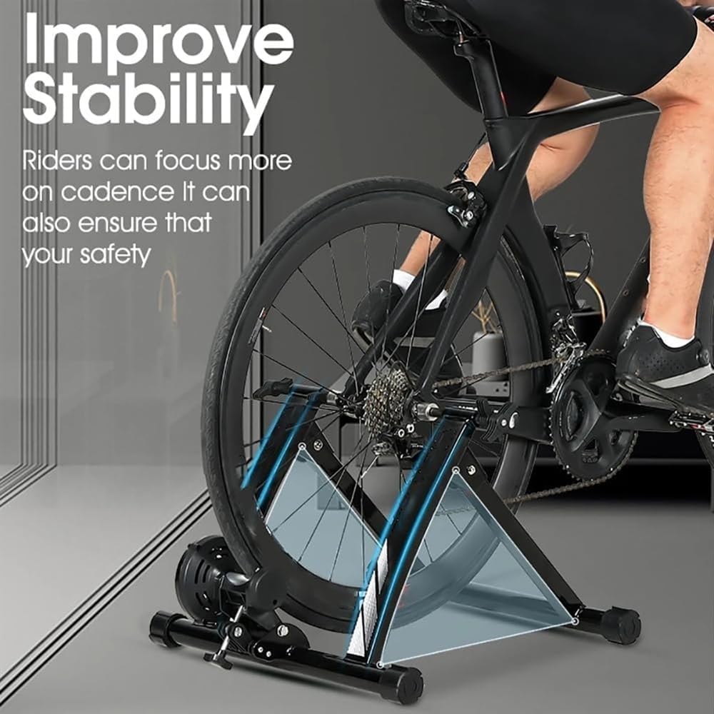 The indoor exercise bike trainer adopts a double support structure design.At the same time, you can easily fold this bike fitness rack into a compact size for easy indoor storage, especially in tight spaces.Product parametersMaterial: steel, magnet, engineering plasticSize: 54.5*48*37cmResistance: Manual adjustmentApplicable bicycle models: Suitable for 2428-inch bicycles and 700c bicycles (quick release rear wheel)Colour: BlackWeight: 6kgPackage ContentsBicycle trainer*1Front wheel pad*1Quick release lever*1Installation tools (bag)*1