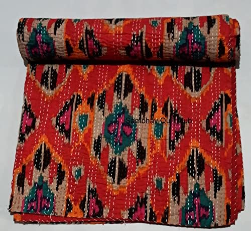 Bohemian Floral Handblock Multi Ikat Print Handmade Cotton Block Kantha Quilting Throw Blanket Hippie Queen/King Size Bohemian Block Print Hippie Kantha Quilt (Red)