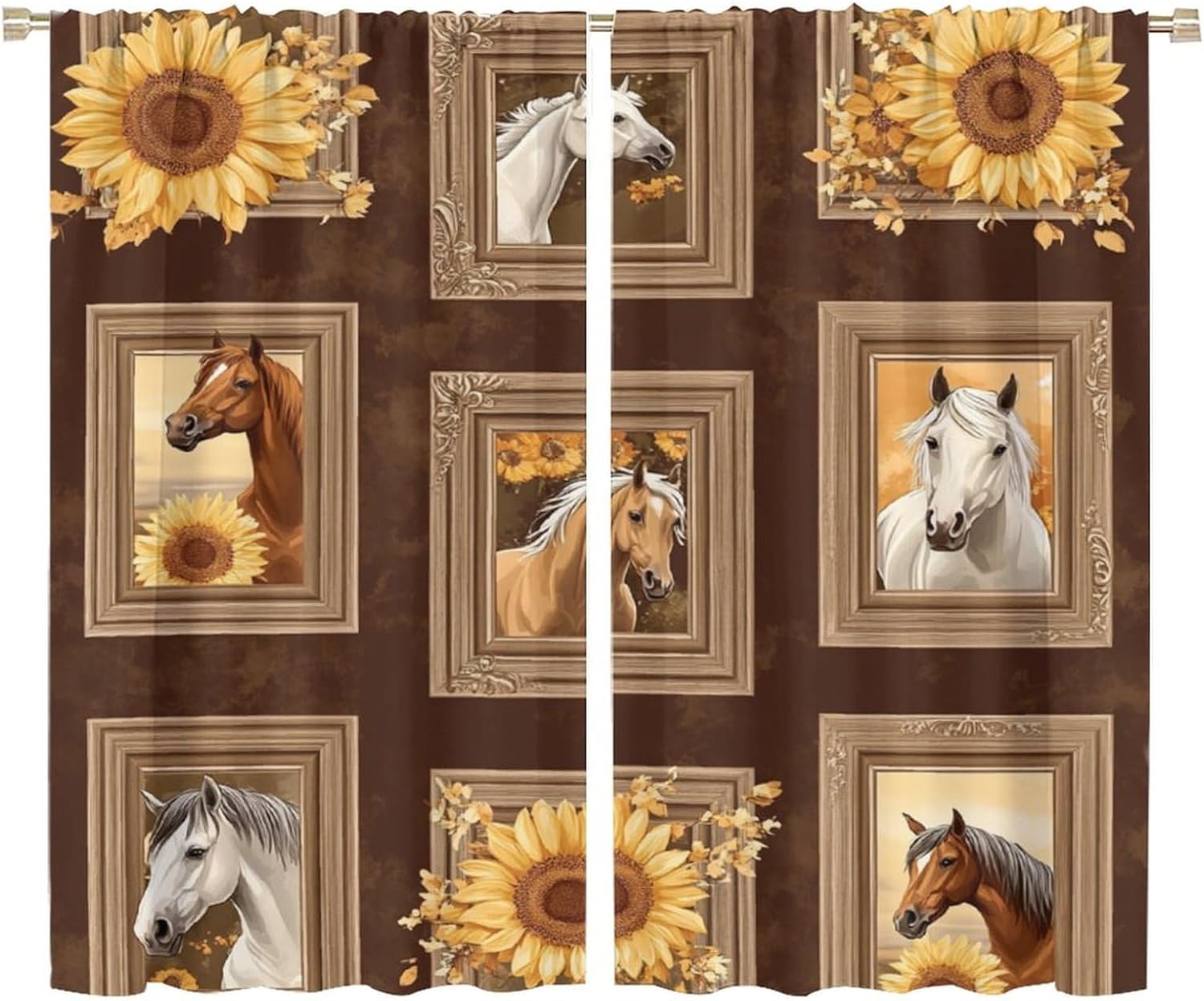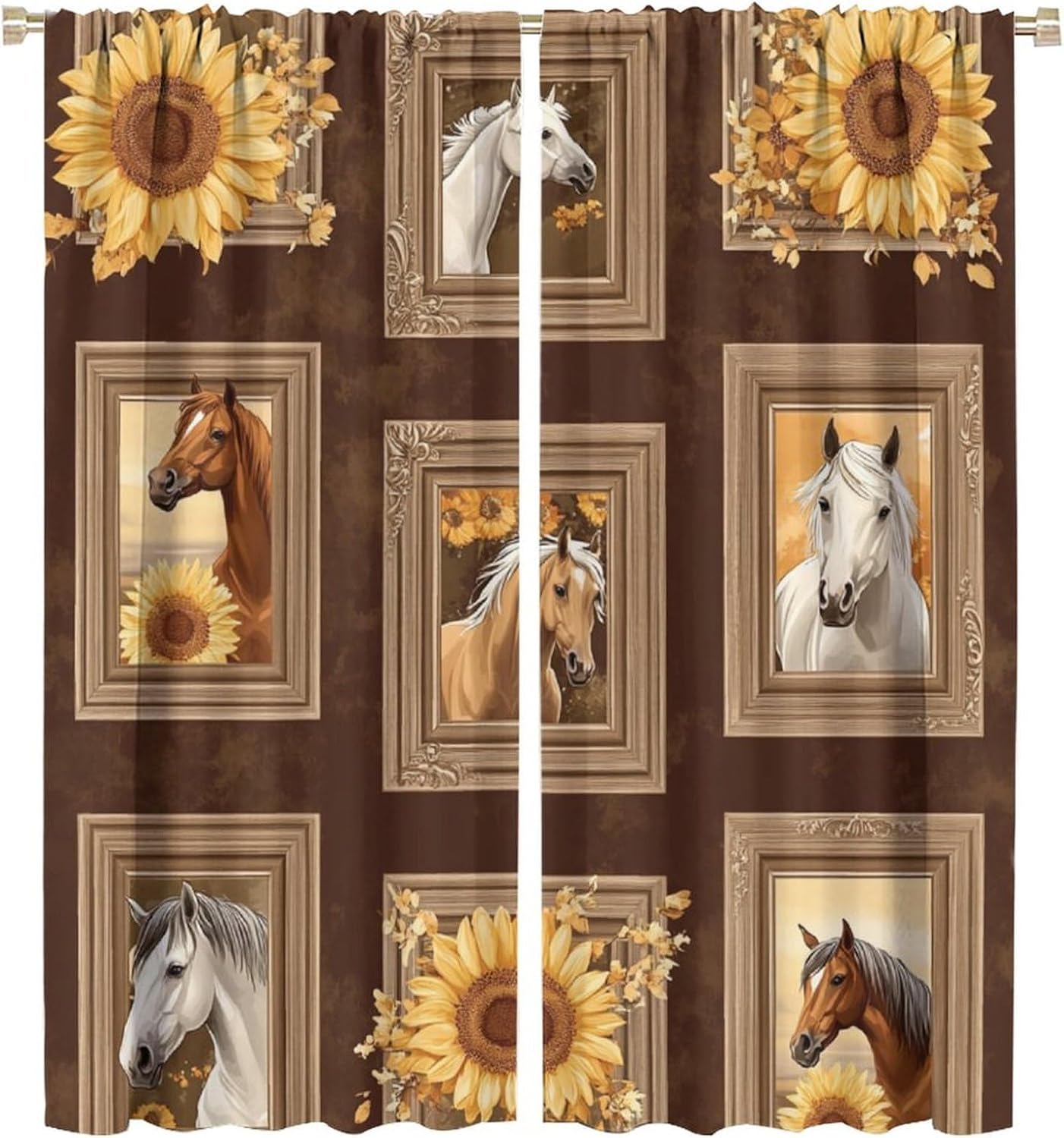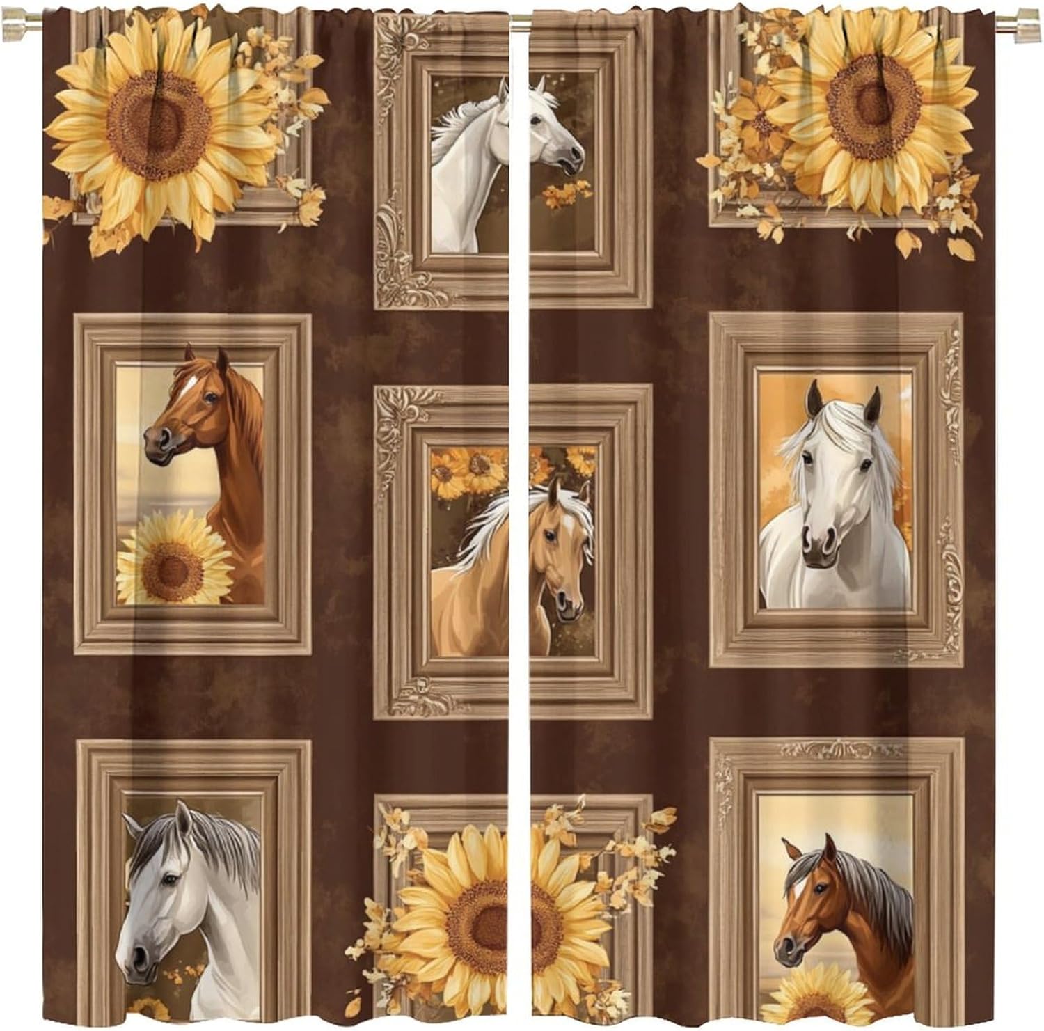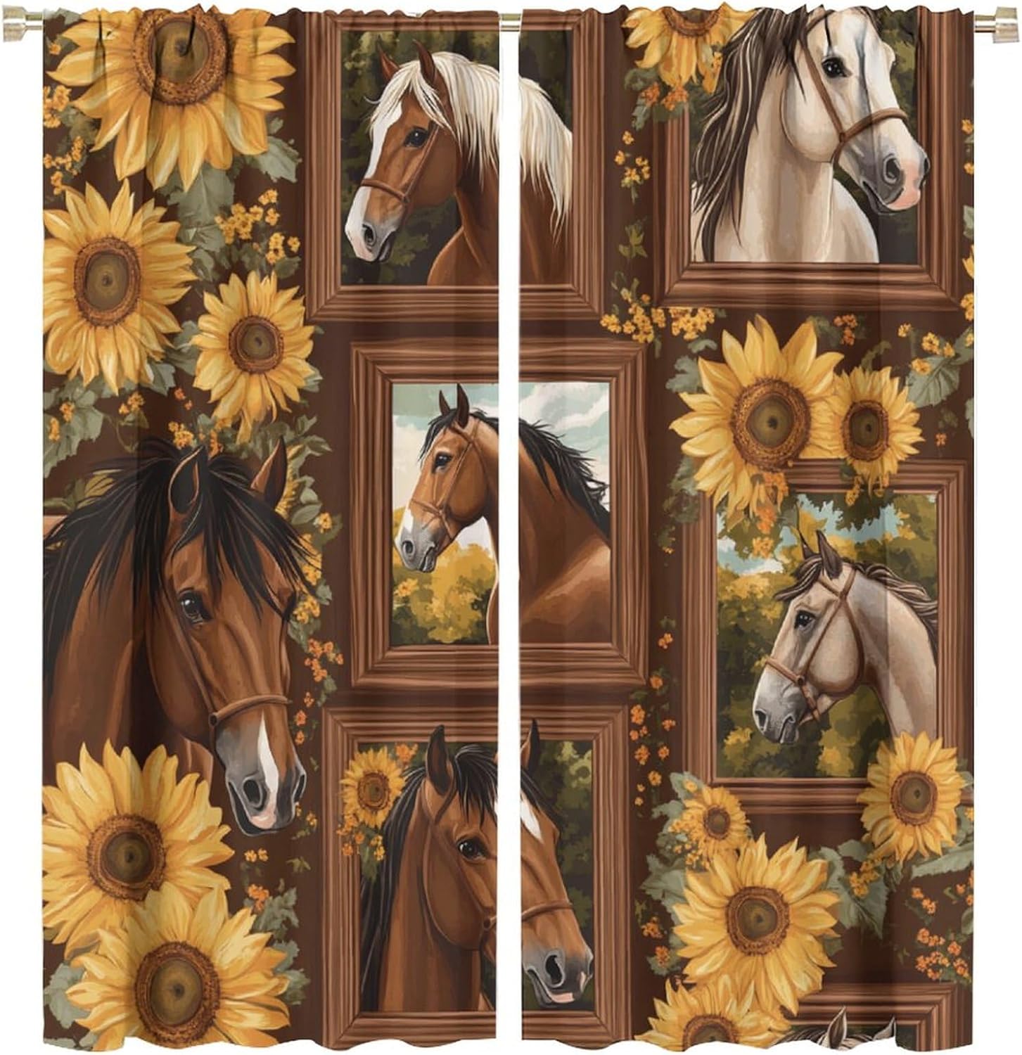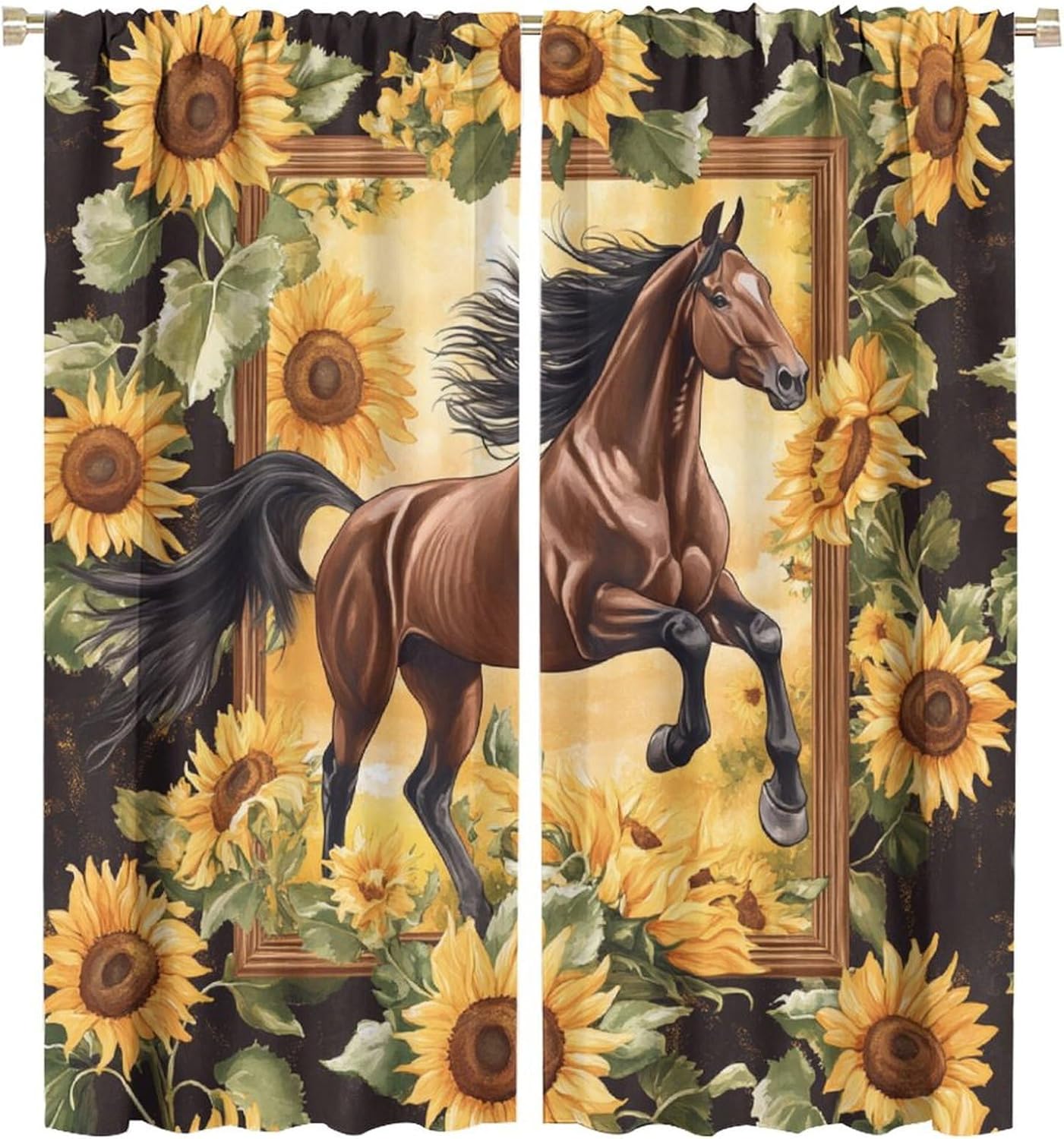 Brown Horse Animal Blackout Curtains for Bedroom/Living Room, Sunflower Art Illustration Curtains Rod Pocket Thermal Insulated Window Drapes, 21W x 45L, 2 Panels