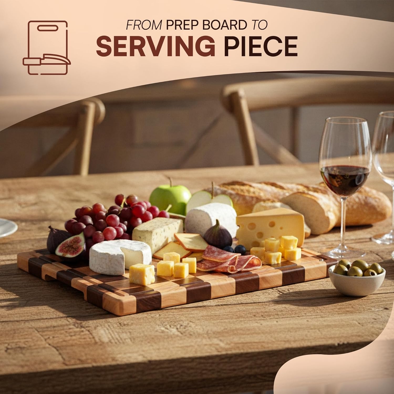 Upgrade your kitchen essentials with the 100% Organic Acacia Wood Cutting Board, designed for performance, durability, and modern kitchens. Made from premium acacia wood, this wooden cutting board offers natural strength and long-lasting reliability for everyday cooking tasks. The End Grain butcher block structure absorbs impact from knives, helping maintain sharp blades while delivering a sturdy cutting surface. Its checkered cutting board design not only enhances visual appeal but also improves surface stability during chopping and slicing. Measuring 16.5" x 11.6", this large wooden cutting board for kitchen use provides ample space for vegetables, fruits, meats, and bread. A deep juice groove helps capture liquids, keeping countertops clean during food preparation. The built-in handle allows effortless lifting and serving, while non-slip pads ensure secure placement on kitchen counters. Perfect for those searching for wood cutting boards for kitchen, this board blends function and style, making it suitable for chopping, carving, and serving in any home kitchen.