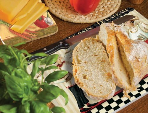 Perfect for prepping, cutting or serving, this glass cutting board from CounterArt features a sturdy tempered glass body that is shatter-resistant and will prove to be a great counter saver. The hygienic, non-porous surface also resists stains, scratches and bacteria. The colorful, artistic design brings a distinctive style to your kitchen or buffet table. Non-skid feet on the back will hold the piece steady while protecting your countertop from scratches. Measures 12 by 15 inches. Dishwasher safe.