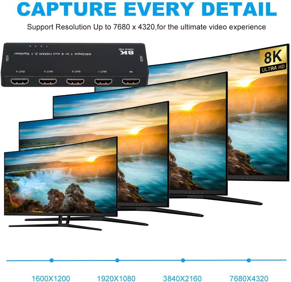 HDMI Splitter Ultra-HD Converter 8K@60hz Compatible 2.1 Switch 1-IN-4-OUT 48Gbps UHD Hub Support HDCP SST Extended 4K@120hz 3.5mm AudioPackage included hdmi hub and USB-C power cable. (HDMI2.0 Cable not included.)1) Ultra HD 8K@60Hz & 4K@120Hz HDMI Splitter– Supports high-resolution video duplication, delivering crisp, lag-free visuals for gaming, streaming, and professional setups. With a separate 3.5mm audio output interface.2) HDMI 2.1 with 48Gbps Bandwidth – Ensures seamless transmission of high-speed signals, compatible with HDR, Dolby Vision, and 3D content. You need connect extra standard HDMI 2.1 cable to enjoy visual effects.3) Stable Mirror Mode (1 Input to 4 Outputs),The HDMI 8K switcher allow you to connect one HDMI source to four HDMI display, Duplicate your HDMI signal across two displays simultaneously without signal degradation.4) Advanced HDCP & EDID Management – Maintains content protection compliance and resolves handshake issues for smooth device recognition.5) Durable Aluminum Housing & Plug-and-Play – Heat-resistant metal casing ensures longevity, while no-driver setup offers instant connectivity. External 5V USB-C power required.