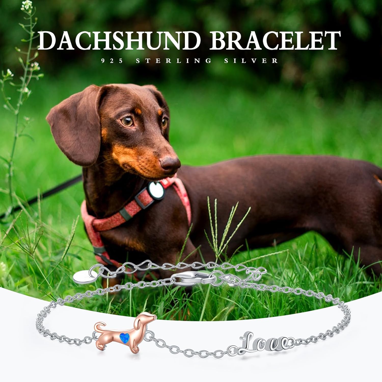 Celebrate your love for dachshunds with this charming sterling silver bracelet that perfectly captures the adorable spirit of these beloved dogs. The delicate design features a rose gold-plated dachshund charm adorned with a striking blue heart detail, connected to an elegant inscription along a dainty silver chain. Crafted from genuine 925 sterling silver, this adjustable bracelet offers both style and durability. The thoughtful combination of silver and rose gold tones creates a versatile piece that complements any outfit. The adjustable chain ensures a comfortable fit for most wrist sizes, making it an ideal accessory for daily wear or special occasions. This bracelet makes a heartwarming gift for dachshund owners and dog lovers alike, serving as a subtle yet meaningful way to showcase their passion for these charismatic canines. The detailed craftsmanship and quality materials make this piece both a beautiful accessory and a lasting keepsake.