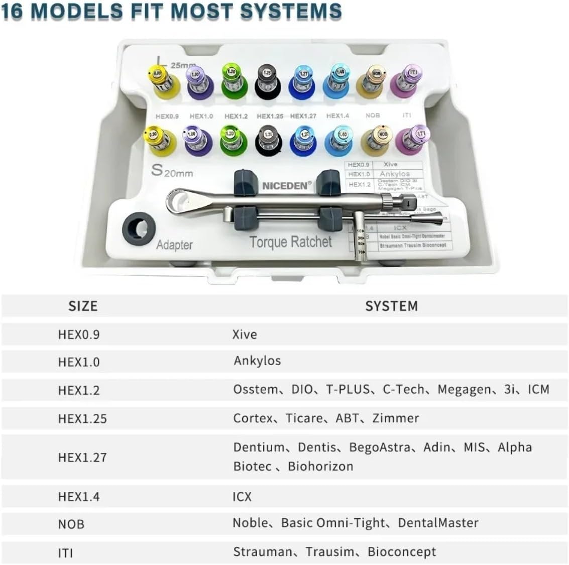 Elevate your dental practice with this comprehensive 16-piece dental implant torque wrench set. This universal kit includes precision ratchet drivers designed for prosthetic procedures and implant repairs. The wrench delivers accurate torque control from 10 to 70 Ncm, ensuring precise adjustments for various dental applications. Each component is fully autoclavable, making sterilization simple and efficient for maintaining proper hygiene standards. The set features versatile drivers and attachments that complement most implant systems, streamlining your workflow. Built with durability in mind, these professional-grade tools offer reliable performance for daily use in dental procedures. The ergonomic design provides comfortable handling during extended operations, while the precision engineering ensures consistent torque application. Perfect for dental clinics and specialists who demand reliable, precise instruments for implant procedures.