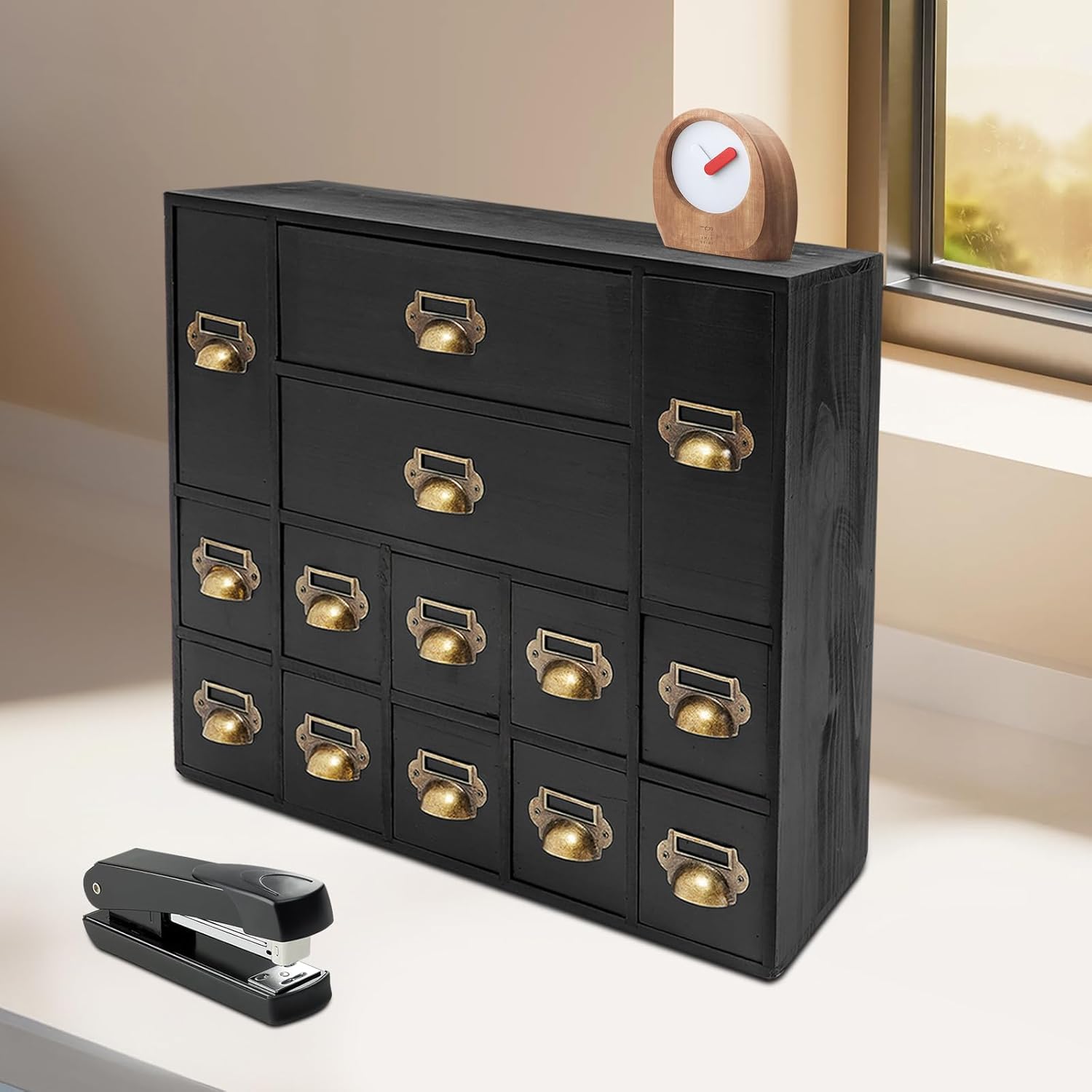 DescriptionOur storage drawer cabinet is an efficient storage furniture designed for homes, offices, and more. It combines practical design and premium materials and is designed to provide users with a storage solution that is both aesthetically pleasing and practical, helping you to better organize and manage your belongings.ApplicationThis product can be used as a Chinese medicine or household medicine organizer, an organizer for various small crafts, a kitchen organizer for tea bags, sugar packets, creamer, instant coffee, etc., a desktop organizer for data cables, staplers, tape, and other small office supplies.SpecificationColor: Black/Old Brown Color/BlueStyle: VintageMaterial: Iron, WoodProcess: Polishing, Sanding, Spraying PaintMounting Type: Free StandingNumber of Drawers: 14Small Drawer Size: 13.5*7.6*7.6cm/5.3*3*3inMiddle Drawer Size: 13.5*7.6*18cm/5.3*3*7.1inLarge Drawer Size: 28.4*13.5*7.6cm/11.2*5.3*3inOverall Product Size: 53*16*42.4cm/21*6.3*16.7inPackage Size: 54*17*43.4cm/21.26*6.69*17.09in Each Drawer Load Capacity: About 3kg/6.6lbs Gross Weight: 3kg/6.6lbsNet Weight: 2.5kg/5.51lbsPackage Included1* Drawers Storage CabinetNotes1. Please check the product size carefully before ordering.2. Please allow the slight color difference caused by the shooting light and 1-3cm error due to manual measurement, and make sure you do not mind before ordering.