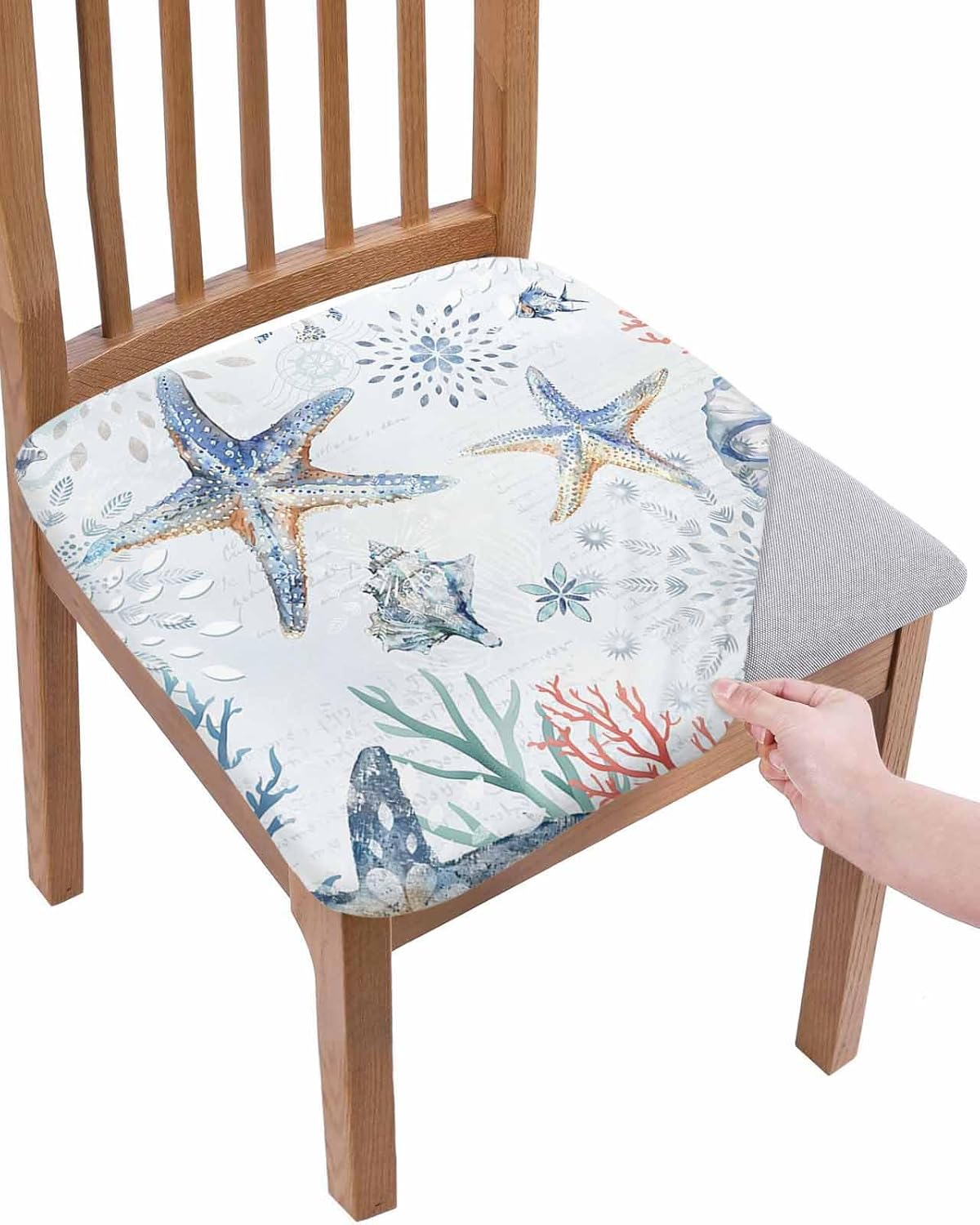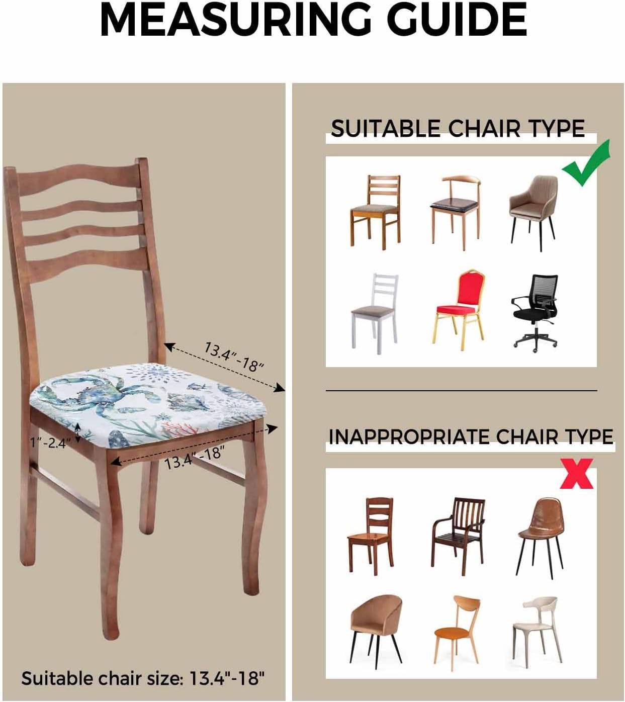 Premium Dining Chair Seat Covers- Our dining chair cover fabric is soft and comfortable, so you don't get tired after sitting for a long time- Exquisite one-sided printing, beautiful and fashionable- Removable and washable, can be reused- The elastic design makes the installation of the seat cover more convenient - The elastic lock side is compliant and does not slipAbout Size: The size of the dining chair cover is 13.7"x 13.7", which can be applied to cushions with a length of 13.4"-18", a width of 13.4"-18", and a thickness of 1"-2.4"Application: office chair cover, cushion covers, dining room chair covers, chair covers for party chair, bar stool covers, wedding chair covers, etc.Holiday Decoration: The embodiment of loving life is not complicated, just the right color is needed. The soft texture of the chair cover feels more comfortable to the touch, and a few simple installation steps inadvertently improve the quality of life.Easy to Install: The scratch-proof chair seat cover is easy to install, suitable for dining chairs, kitchen chairs, banquet chairs, electric wheelchairs, bar stools, armchairs, office chairs, glider ottoman, needlepoint chairs, accent chairs and more.Care Instructions: Avoid washing with other dark colors. Machine wash cold separately, gentle cycle only, do not bleach, tumble dry low or hang to dry.Number of Pieces: 1 pcs/2 pcs/4 pcs/6 pcs Fabric: polyesterFunction: dust-proof/sunscreen/scratch-proof/decorationInstallation stepsStep 1 Remove the seat cushion from your chairStep 2 Slip on the seat cover to the seat cushionStep 3 Fasten the back buckle of the seat coverStep 4 Reinstall the covered seat cushion into the chair
