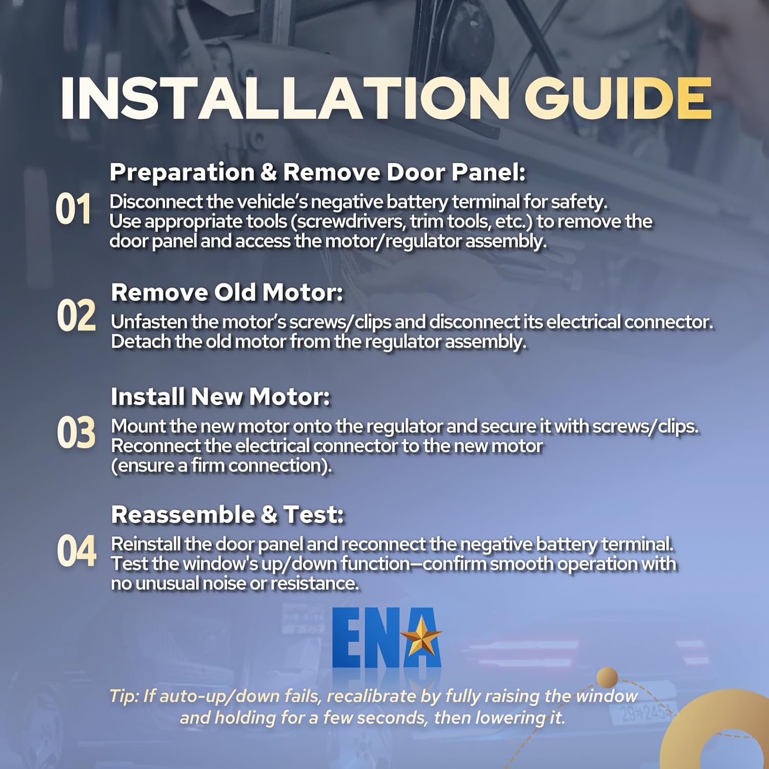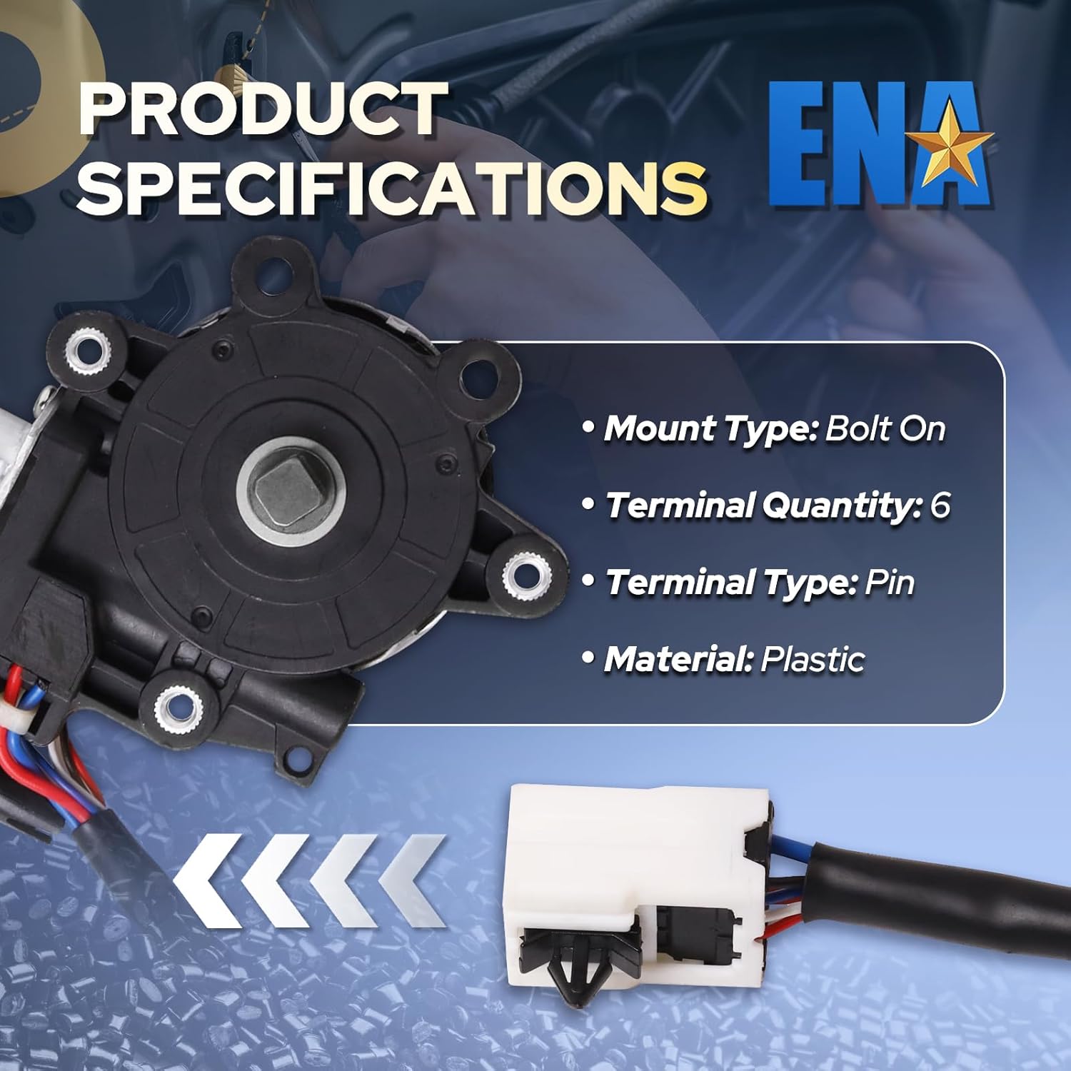 • ENA Power Window Motor Specifications: 1. Position: Front Left; 2. Regulator Included: No; 3. Window Lift Gear Included: Yes; 4. Wiring Harness Included: Yes; 5. Terminal Quantity: 6. The ENA window motor assembly features reinforced high-strength gears to protect against wear and breakage, with application-specific design for optimal efficiency and power output, ensuring long-term reliability