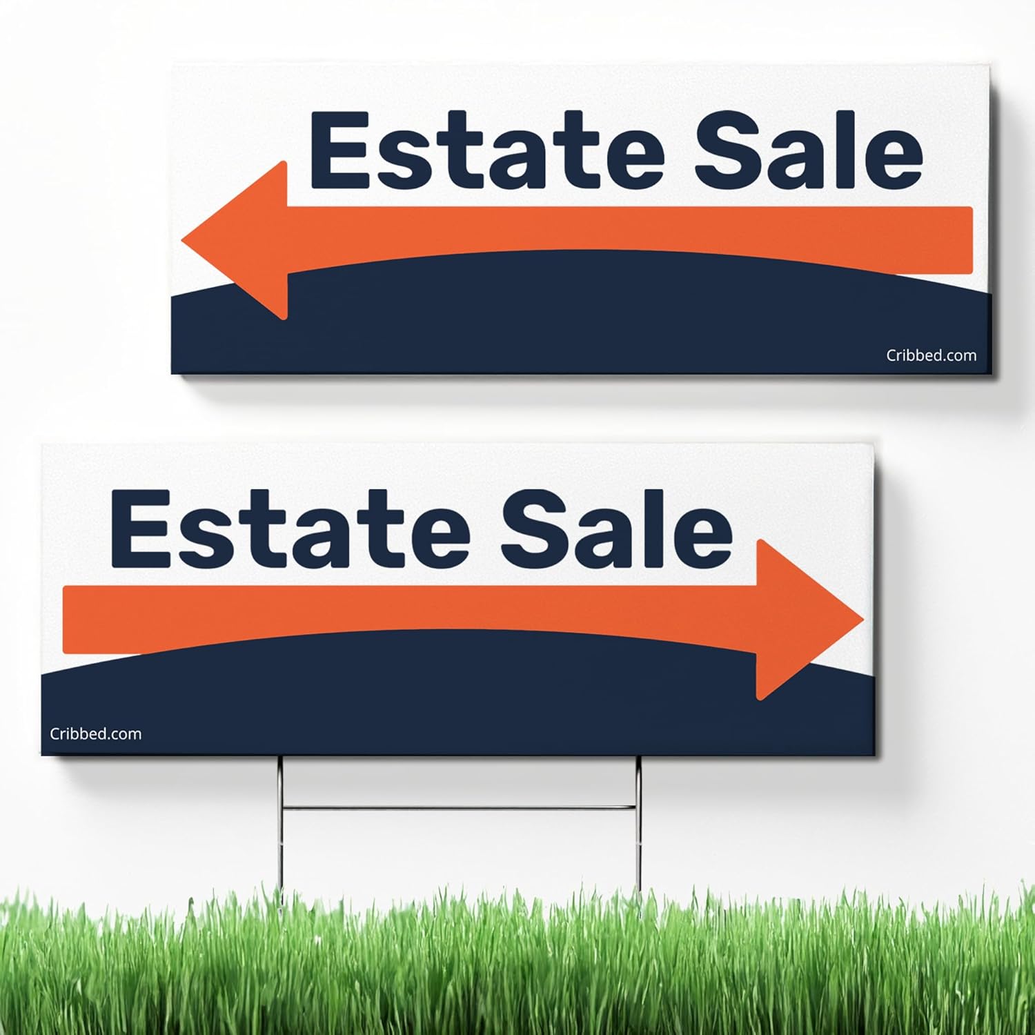 High-visibility estate sale yard sign built to catch attention from passing drivers and pedestrians. Sized at 24 x 9 inches, this weather-resistant corrugated plastic sign is made for outdoor use and repeated setups. Includes a metal ground stake for quick placement in lawns or along roadsides. Clean, modern design suited for estate sales, moving sales, and on-site property sales.