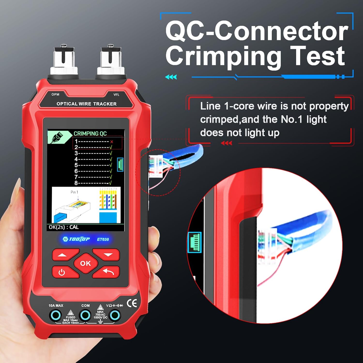 Specifications: Item: Multifunctional Network Cable Tester Color: Black, Red Product Material: ABS Length Measurement: Ethernet Cable (600M)/Telephone Cable (400M)/Coaxial Cable (400M) Wire Connection: Normal/Short Circuit/Broken/Crossed Optical Power: mW/uW/nW/-70.00~6.00dBm Red Function: 10mW (Approximately 10kM) Long on/Flashing (1Hz/2Hz)/off Switch Flash: 10M/100M/1000M POE Device Testing: Standard/non-standard POE, Vole Value/Polarity ID Pairing Function: Optional 1-15 Engineering Accounting: Store Records of 100/unit Price/Amount DC Vole: 600.00mV~1000V (± 0.5%+0.3) AC Vole: 600.00mV~750V (± 0.8%+0.5) DC Current: 600.00mA~10A (± 1%+0.4) AC Current: 600.00mA~10A (± 1%+0.5) Resistance: 600.00Q-60MQ (± 1%+0.6) acitor: 6.0000nF~60MF (± 2%+0.6) Frequency: 6.0000Hz~6 (± 1%+0.1) On/off Buzzing:<10Q buzzing Fuse Specification: CE5 * 20MM 10A/1000V Sreen: 3.2-inch 240 * 320 Dot Matrix Color Screen Battery: Host: 1500mAh; Receiver: 800mah Size: Host: 19.5*8.7*3.5cm/7.68*3.43*1.38inch Package Size: 26*16.8*7.5cm Package Weight: 879g Package List: 1* Line Finder Host 1* Receiver 1* USB Type-C Cable 1* RJ45 Cable 1* Crocodile Clip 1* Probe 7* Adapter 1* Instruction Manual 1* Storage Bag