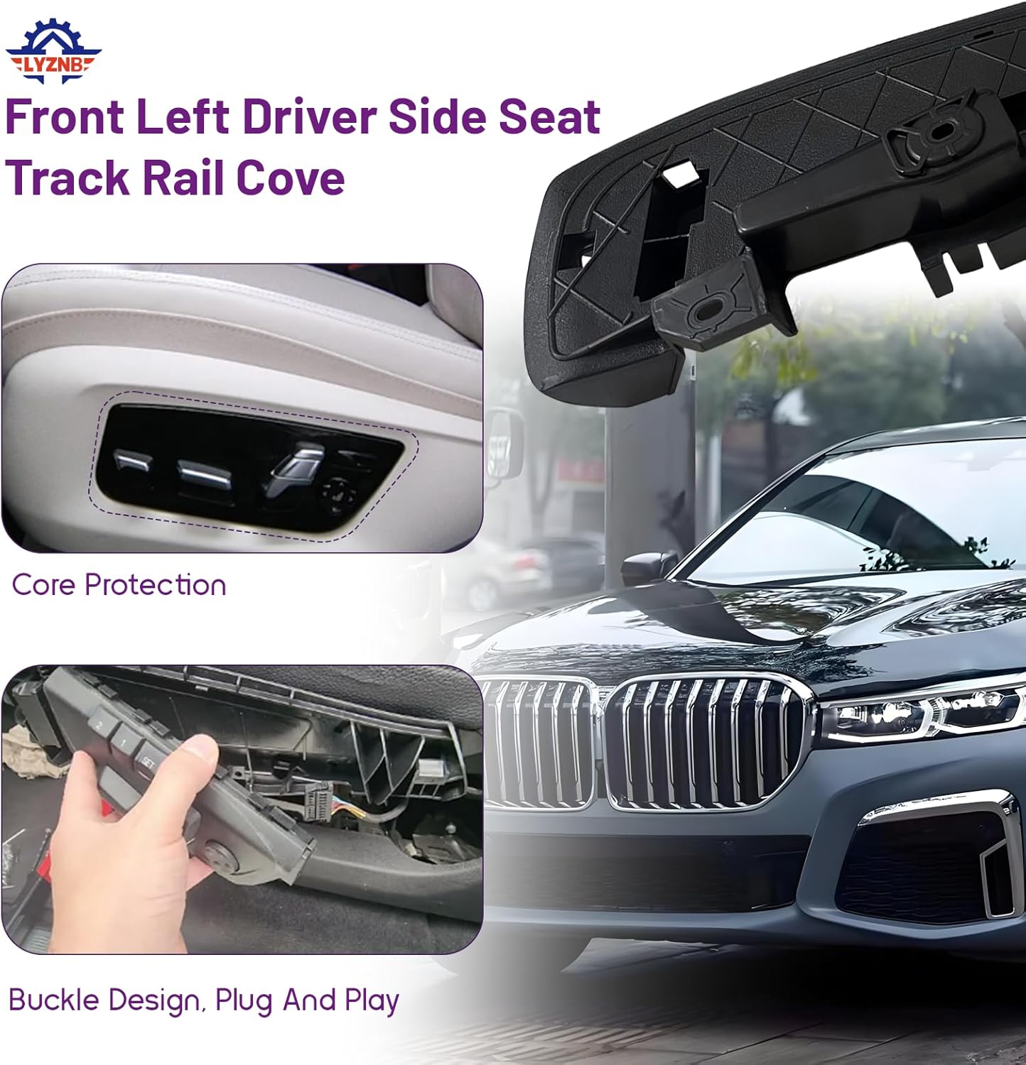 Material:PlasticColor:BlackWhy choose this item:Protect the seat slide rails from impurities, avoid potential safety hazards, and make the interiors cleaner and more attractive. Front Left Seat Track Rail Cover 's definitely worth replacing!Installation method:Remove the old track cover, align it with the seat slide rail latchs or screw holes, and then fasten or tighten the new track cover.Q&A:Q: How compatible is this seat track rail cover?A: Our Front Left Seat Track Rail Cover precisely fits for the BMW 5 Series F07, F10, F11, G30, G31, 6 Series G32, for 7 Series F01, F02, F03, G11, G12, X5, X6, etc. Front Left Seat Track Rail Cover is completely manufactured according to the factory specifications and can perfectly fit your car. After installation, Front Left Seat Track Rail Cover fits tightly without any looseness or interference with the seat adjustment function.Q: How is the product quality?A: Front Left Seat Track Rail Cover is made of high-quality plastic material, with excellent durability and anti-wear ability. Front Left Seat Track Rail Cover can effectively resist friction, collision and temperature changes inside the car during daily use. Front Left Seat Track Rail Cover is not prone to deformation or cracking over a long period of use, ensuring long-term and reliable protection for your seat track.Q: Is the installation complicated?A: The installation is very simple. Front Left Seat Track Rail Cover is designed as an plug-and-play method, without the need for complexs assembly processes. You just need to easily remove the old track cover and then directly install the new one in place. No professional tools or assistance from professionals is required, saving your time and energy.Q: How is the Front Left Seat Track Rail Cover 's appearance design?A: The appearance design is simple and elegants, highly compatible with the interiors style of each for BMW. Front Left Seat Track Rail Cover ’s color and texture complement the interiors environment well, adding a touch of refinement and beautys to your car's interiors and enhancing the overall style.Q: How does its protective effect specifically manifest?A: Front Left Seat Track Rail Cover can provide all-round protection for the seat track, preventing various debris from entering, avoiding wear of the track components due to debris, and reducing friction noises during seat adjustment to create a quieter and more comfortable driving environment.Note:1.Please check the part number carefully.The product information is for reference only.2.If you are not sure about the item, please contact us before purchase to avoid unnecessary returns, thank you!