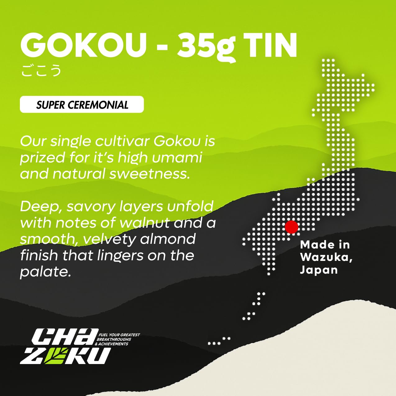 Chazoku Matcha Green Tea Powder - Single Cultivar Gokou - 100 gram bag Our single cultivar Gokou is prized for it’s high umami and natural sweetness. Deep, savory layers unfold with notes of toasted walnut and a smooth, velvety almond finish that lingers on the palate. A rare matcha with richness you can taste from first sip. Best as usucha (thin tea) and unique lattes. Single Cultivar Gokou 100 gram Bag: Single Cultivar Gokou: A unique and high-quality variety of matcha, known for its exceptional flavor profile. Ceremonial Grade First Harvest: Stone milled and shaded for 21 weeks prior to harvest to retain the highest depth of flavor and vibrancy of colors. NUTRITION FACTS: 0 calories, total fat 0g, total sugar 0g, protein 0g. Size: 100g bag 20.3cm x 13.2cm Net WT: 100g
