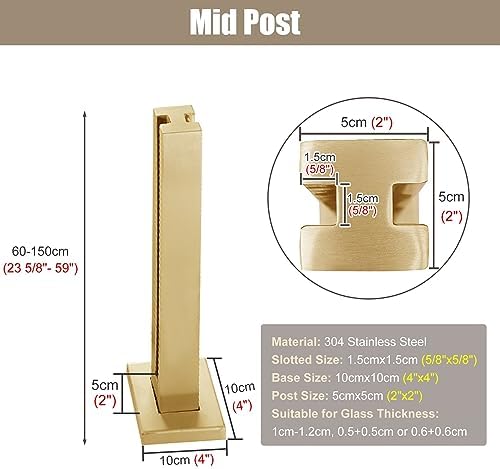 Upgrade your outdoor space with our premium Glass Railing Post, designed to enhance the beauty of your deck, patio, or veranda while ensuring an unobstructed view. The sleek and modern design complements any architectural style, making it an ideal choice for both residential and commercial settings. **Package Includes:** - 1 x Glass Railing Post - 1 x Base Cover - Installation Accessories **Specifications:** - Color: Brushed Gold - Material: 304 Stainless Steel for durability and corrosion resistance - Post Size: 5cm x 5cm (2'' x 2'') - Base Size: 10cm x 10cm (4'' x 4'') - Post Slot Size: 1.5cm x 1.5cm (0.6'' x 0.6'') - Height Options: 60cm-150cm (23 5/8"-59") - Compatible Glass/Wood/Plastic Thickness: 10mm, 12mm, or 5+5mm, 6+6mm **Key Features:** - Smooth design with no exposed welds to minimize safety risks. - Versatile options include middle, corner, and end posts for various configurations. - Simple installation without the need to drill holes in the glass, saving you time and effort. - Easy maintenance—just wipe with a cloth to remove dust and maintain appearance. - Sturdy heavy-duty base ensures stability and safety for both flat surfaces and stairs, perfect for indoor and outdoor use. - Built to withstand rust, high temperatures, and harsh weather conditions, ensuring long-lasting performance. **Important Notes:** - Glass panels must be sourced from a local provider. - Allow for slight measurement variations due to manual sizing. - Color may vary slightly from images due to lighting and display settings. **Customer Satisfaction:** We are committed to providing quality service. If you have any questions or concerns about our product, please do not hesitate to reach out to us. Elevate your space with our stylish and functional glass railing solution today!