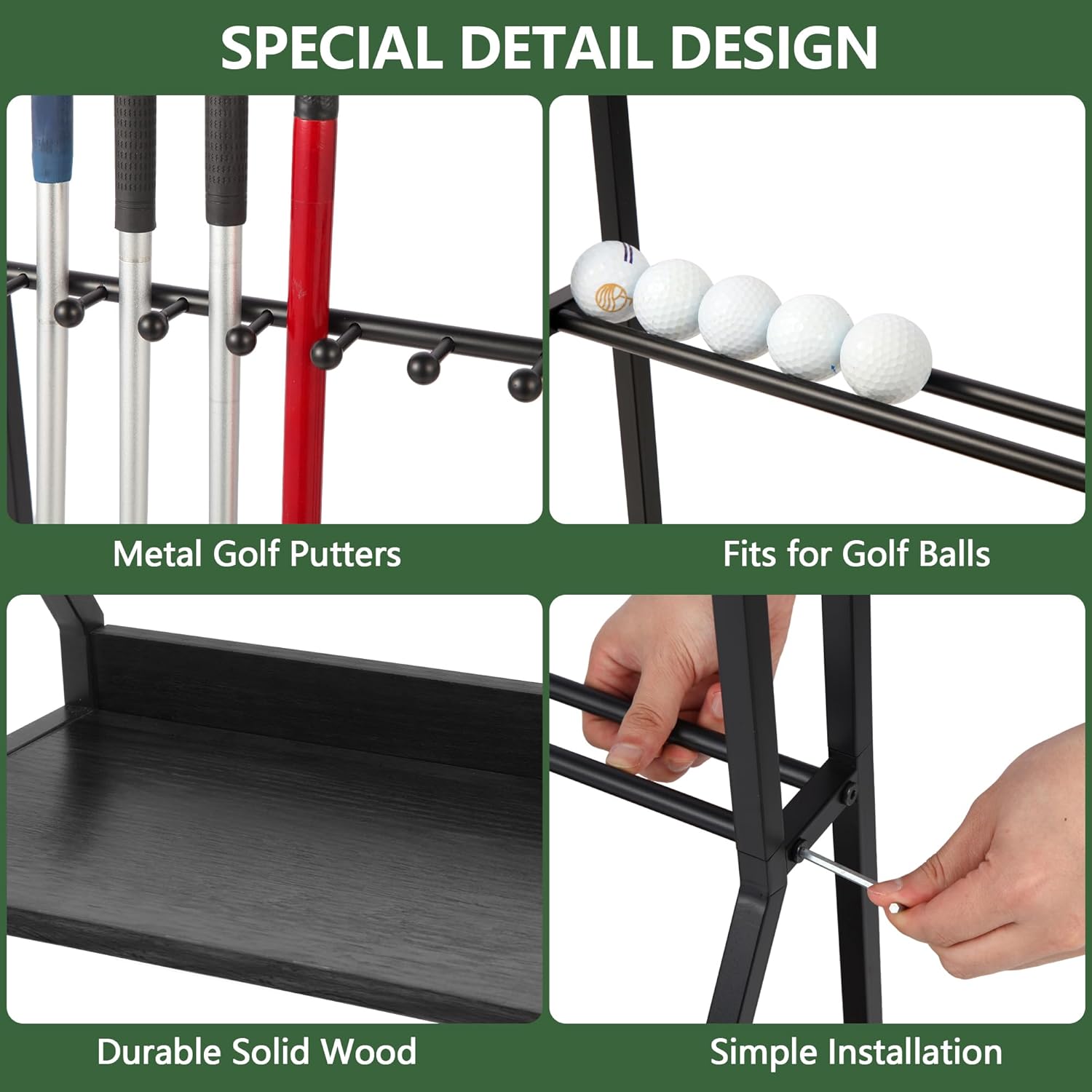 Solid Wood & Iron Golf Club Rack for 9 Clubs & 9 Balls