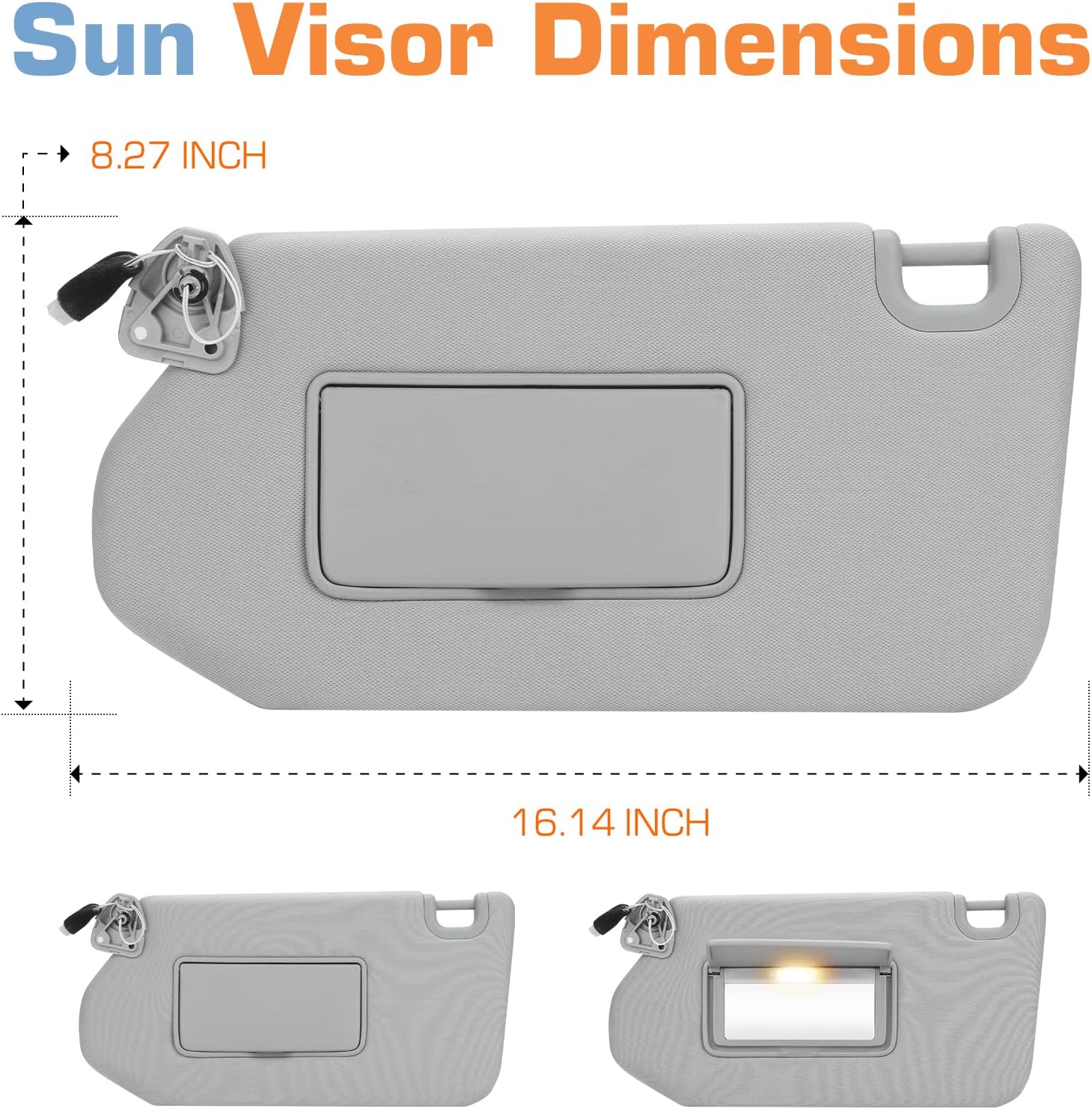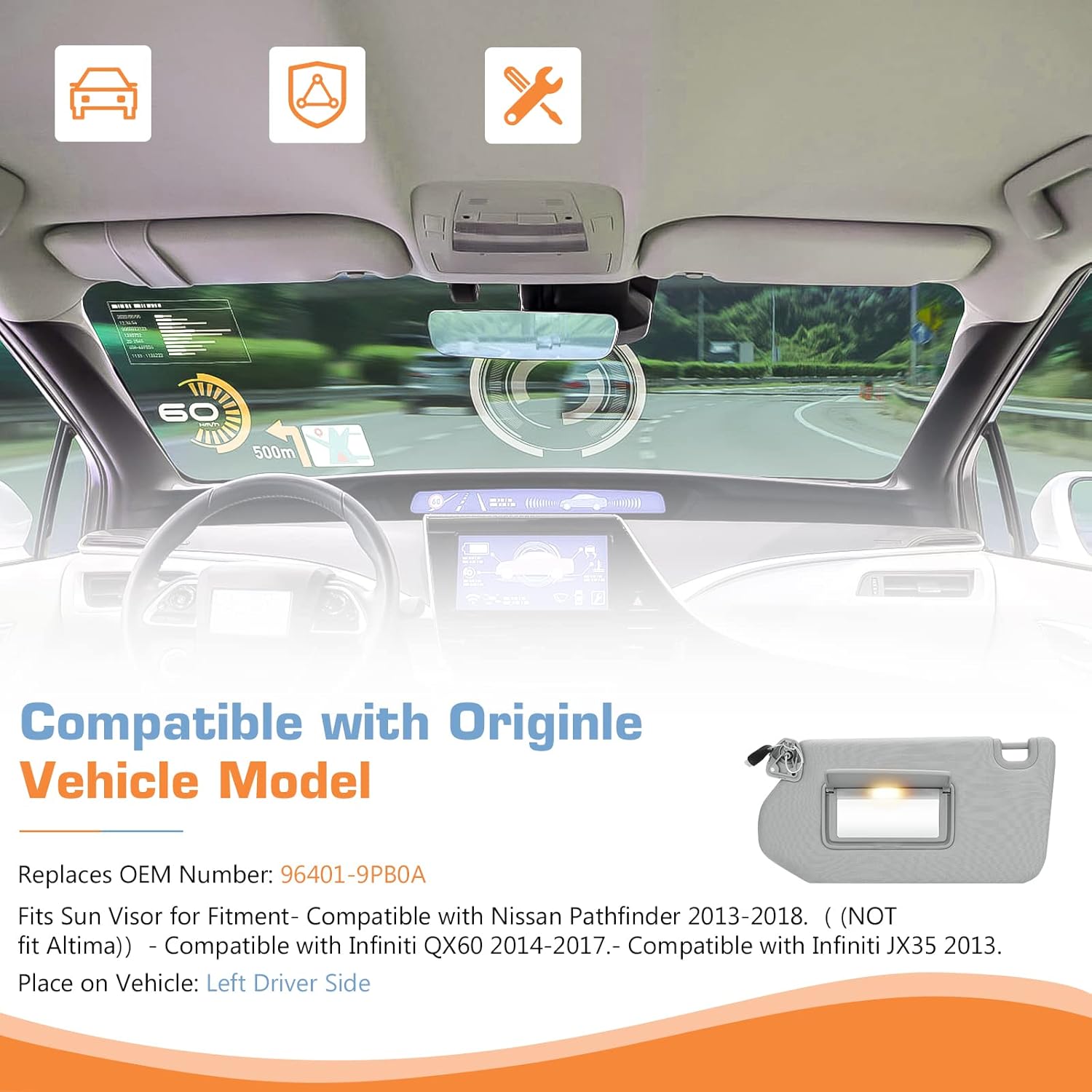 Left Driver Side Sun Sivor Replace Part Number:96401-9PB0ALeft Driver Side Sun Visor Fitment:Fit For 2013 Nissan Pathfinder(NOT fit Altima) Fit For 2014 Nissan Pathfinder(NOT fit Altima) Fit For 2015 Nissan Pathfinder(NOT fit Altima) Fit For 2016 Nissan Pathfinder(NOT fit Altima) Fit For 2017 Nissan Pathfinder(NOT fit Altima) Fit For 2018 Nissan Pathfinder(NOT fit Altima) Fit For 2014 QX60Fit For 2015 QX60Fit For 2016 QX60Fit For 2017 QX60Fit For 2013 Infiniti JX35Specification:Type: Left Driver Side Sun SivorColor: GrayPlacement on Vehicle: Left Driver SideLight: YesHurotoms Vehicle Sun Visor:The Car SunVisor is used to block the sun from all directions for passengers and the co-pilot during normal driving. As a more frequent and important part in the daily use of cars, long-term exposure to the sun will cause damage to the buckle, resulting in loss of shielding effect, and even traffic accidents in severe.Package List: 1 x Left Driver Side Sun Sivor