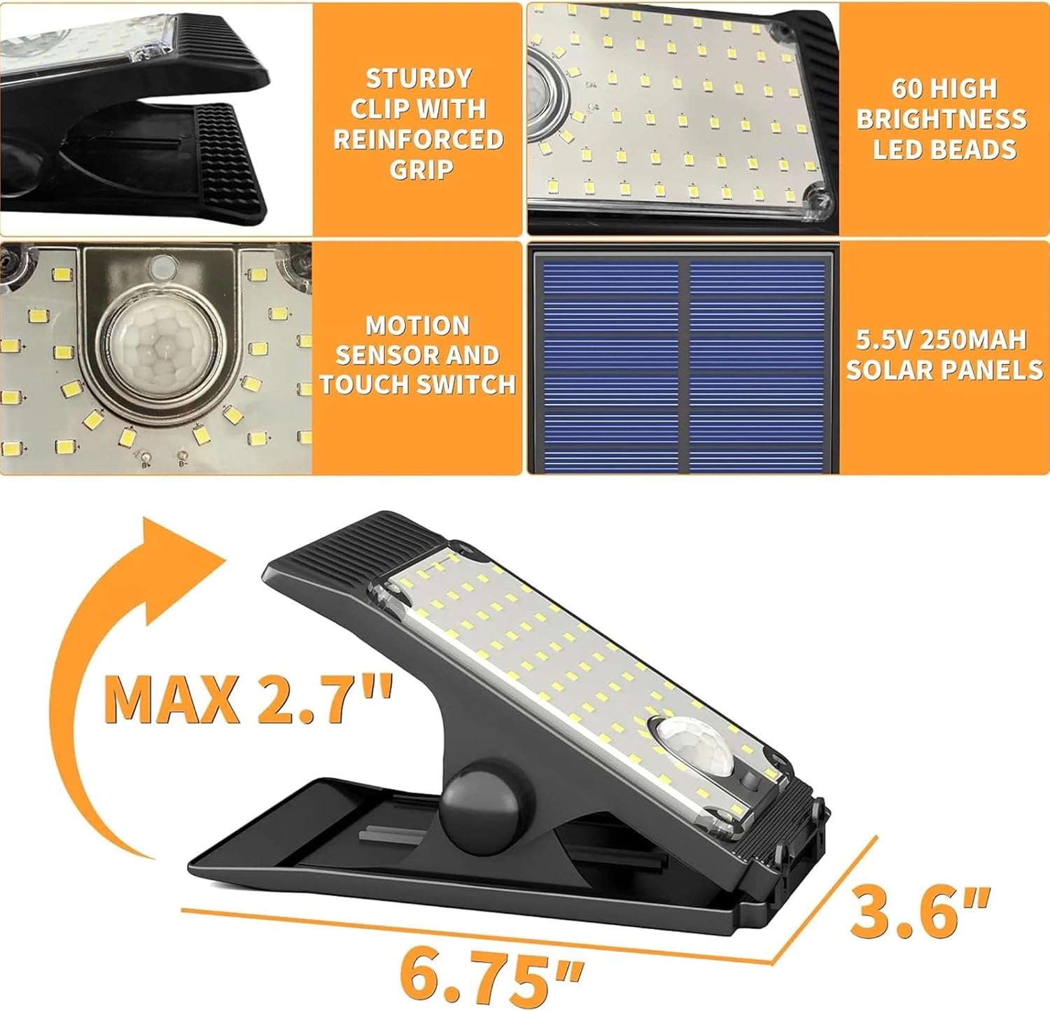 【 Clip-On Design & Tool-free Installation 】Sturdy clamp fits fences, grills, poles, or walls (up to 2.7 inch thickness). No tools needed – just clip and go! Awesome solar chicken coop light, grill lights for outdoor grill.【 Solar Motion Lights Outdoor 】Built-in motion detector activates 60 super bright LED lights when movement is sensed within 10 ft. Perfect for security lighting or nighttime convenience.【 Auto On & Off 】Equipped with high-efficiency solar panels, these lights automatically charge by day and illuminate up to 12 hours at night. No wiring or electricity costs!【 Versatile for Multiple Scenes 】Use as grill lights for outdoor grill BBQ, solar fence lights, pathway lights for gardens, security lights for garages, or decorative lights for patios. Includes 1 packs for wider coverage!【 IP67 Waterproof & Durable 】Rugged ABS housing withstands rain, snow, and extreme temperatures (-4°F to 122°F). Ideal for year-round outdoor use.【 Excellent Customer Service 】We offer peace of mind with a one-year free replacement warranty and responsive customer support to assist with any questions or concerns, ensuring your purchase is completely worry-free.