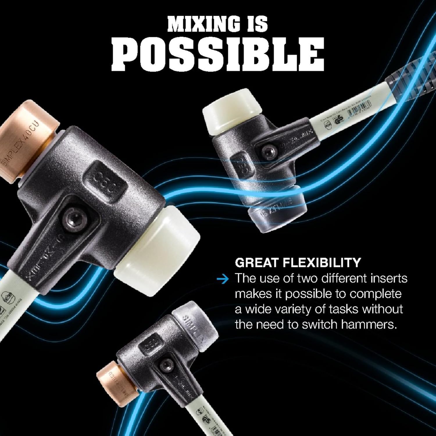 The SIMPLEX series 3748 comprises the insert combination of copper / nylon. Representing the hardest insert in the SIMPLEX selection, the copper insert (series 3804) produces extremely high impact forces but in a way that is gentler compared to a steel hammer. It is the replacement for a conventional copper hammer. The nylon insert (series 3208) offers outstanding impact qualities and is guaranteed to combine maximum strength with unique durability. It is composed of extruded and extremely homogeneous material. Compared to injection molded plastic inserts, it is therefore considerably more wear-resistant and durable and will never chip even in sub-zero temperatures. Moreover, it is also oil and grease-resistant. The black, reinforced cast iron housing provides for greater stability thanks to the enlarged wall thicknesses and struts. The increase in weight ensures greater impact force. Extremely rugged and durable, the fiberglass handle offers exceptional break resistance. It is shaped ergonomically and includes a non-slip handle. It possesses a smooth surface and is inorganic (non-sensitive to moisture). In line with the smart SIMPLEX principle, all components are replaceable and can be retrofitted. This translates to savings in both money and resources.