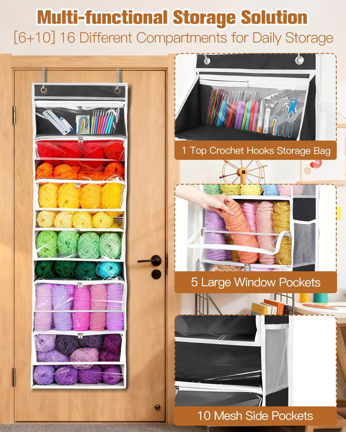• PVC Visualization Window: This over the door yarn organizer designed with clear window compartment and pocket, you can clearly see the yarn balls on each layerand find it quickly without opening every compartment. Manage your crochet yarn kit easily and enjoy a clutter-free space