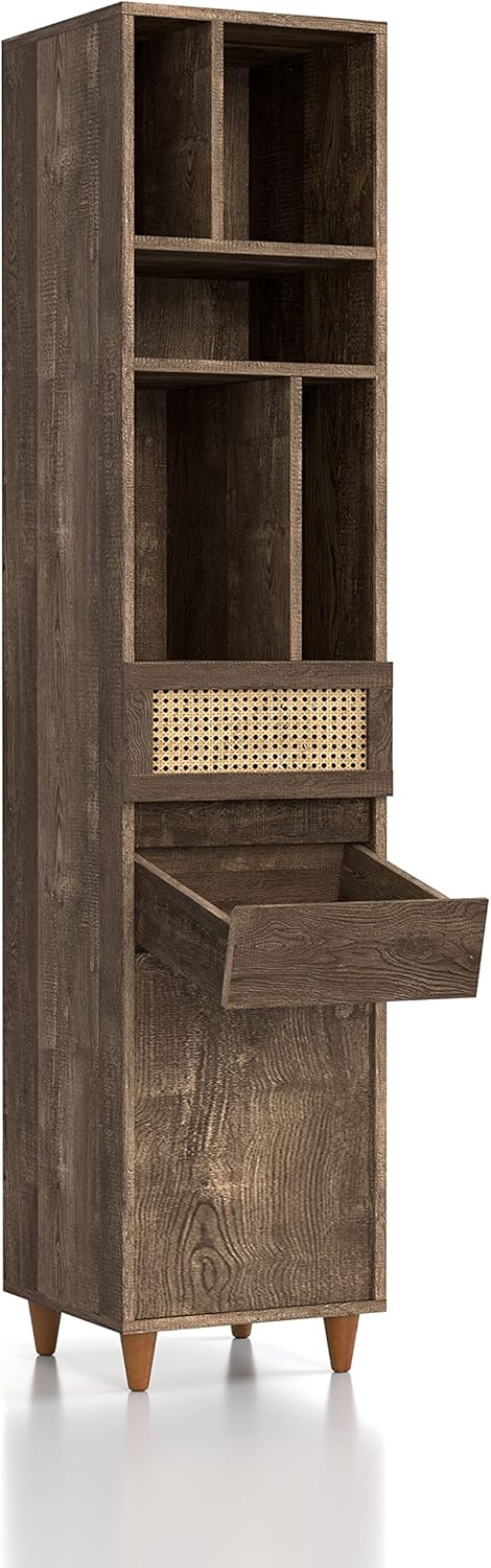 Make a modest update to your home with this reclaimed oak TV tower. The floor-space-conscious design is a compact yet versatile function. Tuck into the living room as a convenient shelf for movies and games in your entertainment space. Two hidden drawers and a cabinet door offer further storage for small accessories such as batteries and remotes. Standing on tapered feet and adorned with a rattan drawer front this wood tower serves a mid-century modern or bohemian style living space.