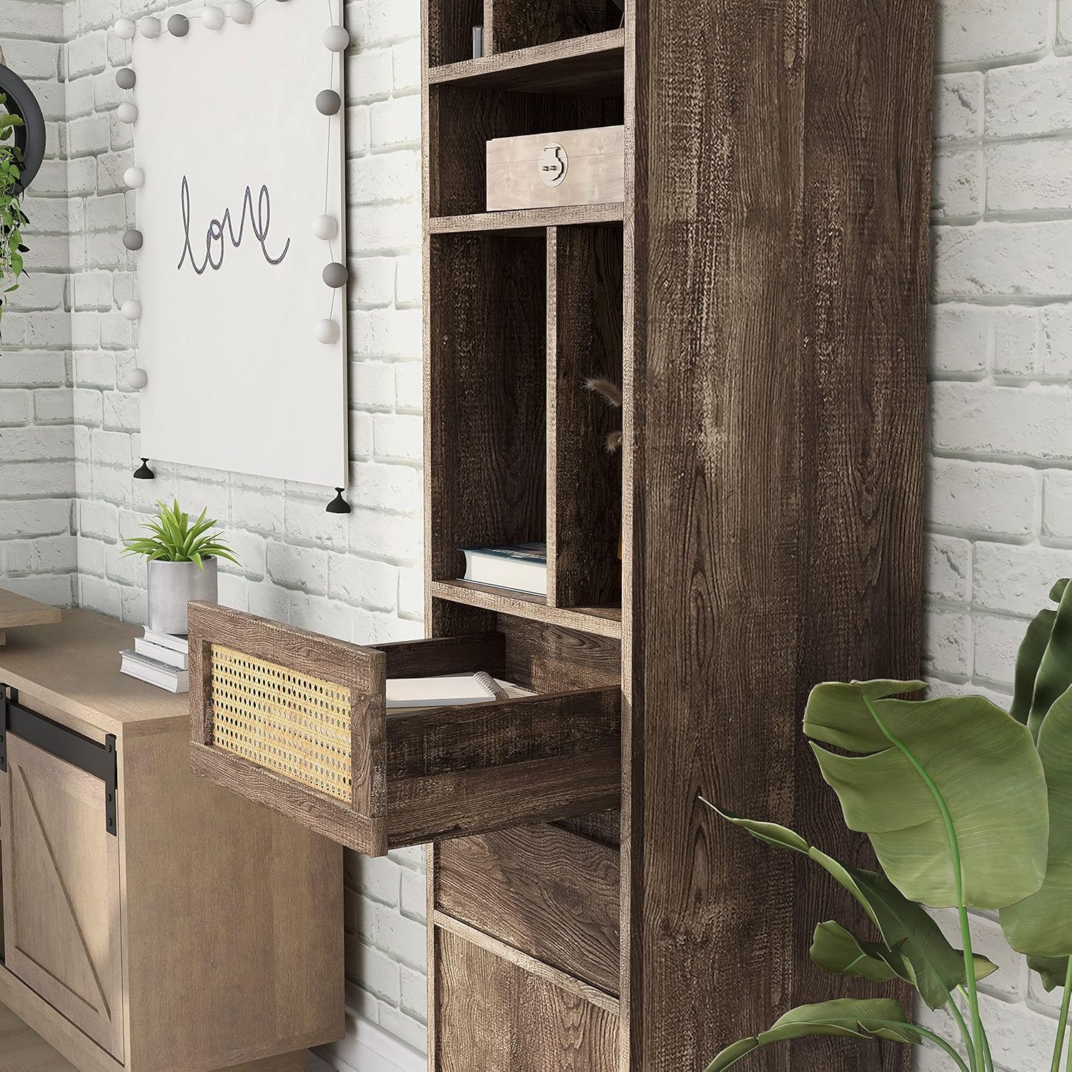 | Item Type Name | Farmhouse Multi-Storage Wood 17 in. TV Tower with 1 Cabinet, 2 Drawers, 5 Shelves for Family Room, Entertaining, Movie Night |