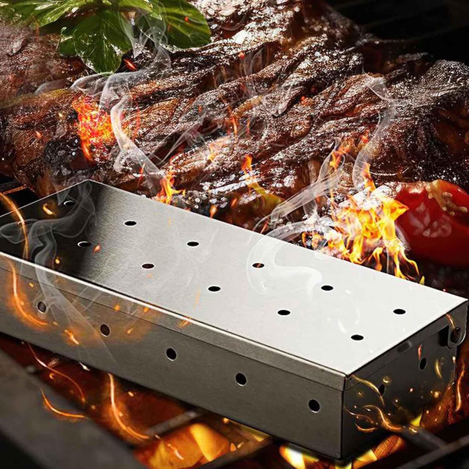 Outdoor Barbecue Tools Stainless Steel Smoker Box Charcoal Fruit Wood Chip Smoker Box to Add Smoky Flavor to FoodFeature: Suitable for all grills and smokers, smoke completely passes through hot and cold smoking. Uniform air holes, thickened 430 stainless steel, no rust, no deformation, durable. Can directly contact food, non-toxic and odourless. Can be placed stably without shaking at will. Large capacity smoking box, filling and accommodating enough. Specification: Name: Smoking Box Specifications: 22X9.5X 4.3cm Style: Round hole, Y hole Purpose: Hot and cold smoking food Material: 430 stainless steel Net weight: 320g Thickness: 0.6mm Steps: 1.Fill the smoking box with fragrant wood 2.Let it catch fire and burn for 3-5 minutes 3.Blow out the flame and put it on the grill Package Included: 1 * Smoking Box