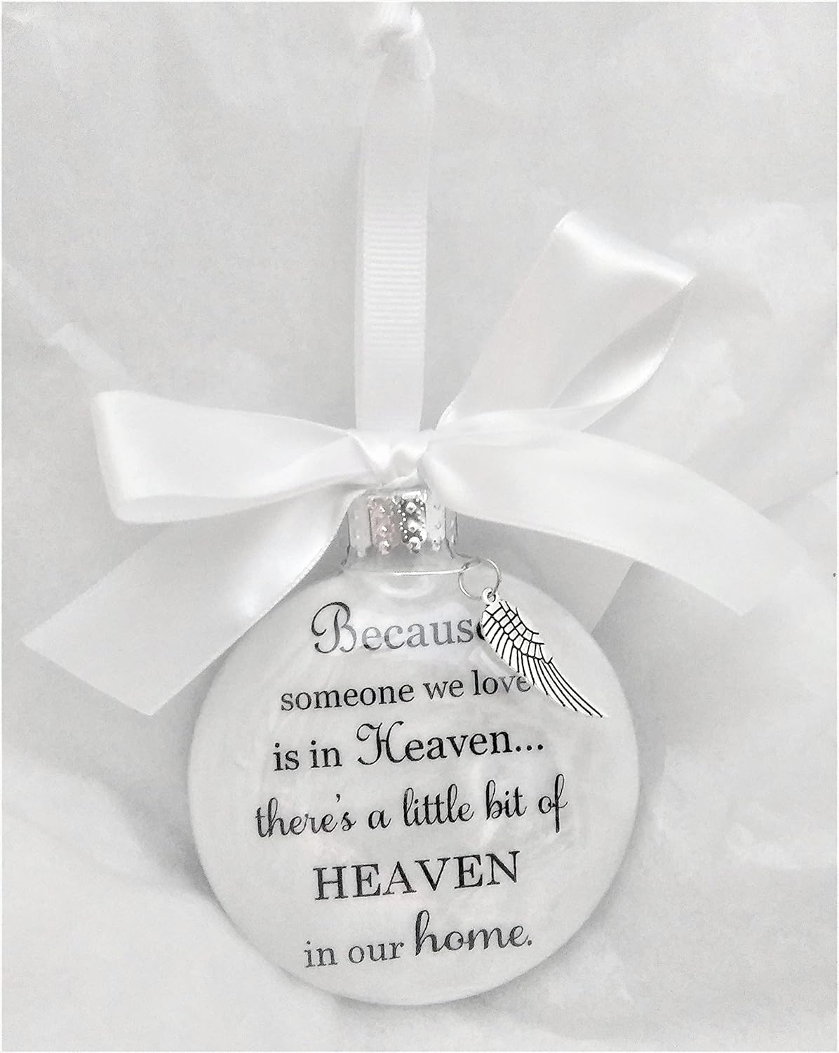 This beautiful 3 inch (approx. 10 cm) round, 1 inch thick glass ornament is filled with soft white feathers (they show through the back of the ornament) and vellum printed with the words "Because Someone We Love is in Heaven, There's a Little Bit of Heaven in Our Home." And can be personalized with your loved one's name. (Personalization is available at no additional charge.) Your choice of bow color- please choose your preference from the menu options. You can also choose to add a charm to hang from the neck of your ornament. **The font style may be changed to fit long personalization** Display stands are also available from the drop down menu if you would like to display your ornament year round. *PLEASE NOTE: If you purchase the pictured product from anyone other than myself, Christy Wilcox at The Creative Canvas, you are NOT purchasing the item pictured. **All images shown were taken by myself, Christy Wilcox at The Creative Canvas, of my original handcrafted ornaments & designs; therefore, are my property, and are NOT to be used by anyone other than myself.