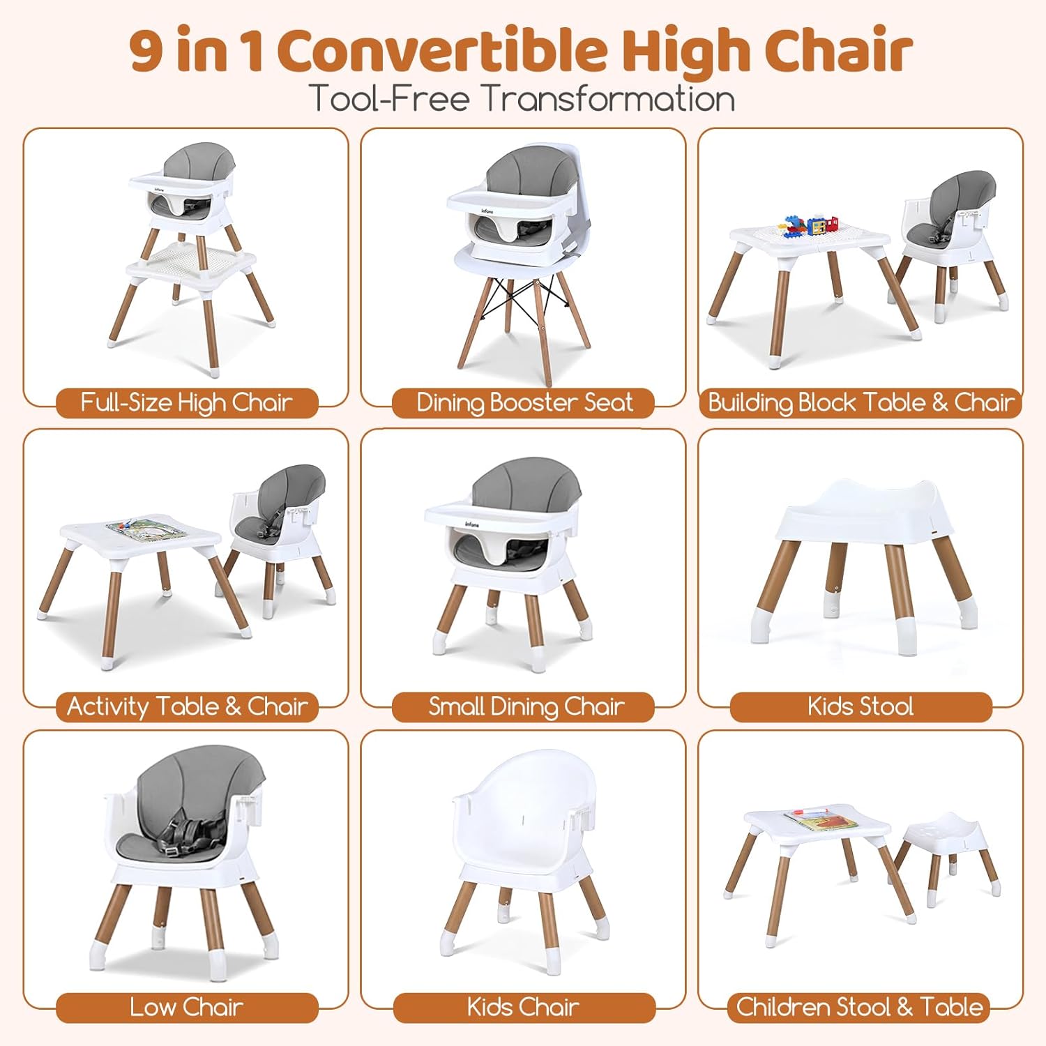 INFANS 9 in 1 convertible high chair for babies and toddlers is truly a thoughtful companion for baby’s growth journey, accompanying child every step of the way from 6 months old through the preschool years! It effortlessly transforms into 8 different configurations, perfectly catering to baby’s diverse needs—whether it’s mealtime, playtime, or study time. The baby chair for eating covers all the varied scenarios of child’s growing-up years. When it comes to details and safety, we prioritize your baby’s comfort and protection above everything else. Assembly and daily cleaning are also incredibly hassle-free. Choose this silla de comer para bebe, and it will not only meet all baby’s needs at every stage of growth but also bring ultimate convenience to parents, making it an excellent choice for enhancing the happiness of your family life.