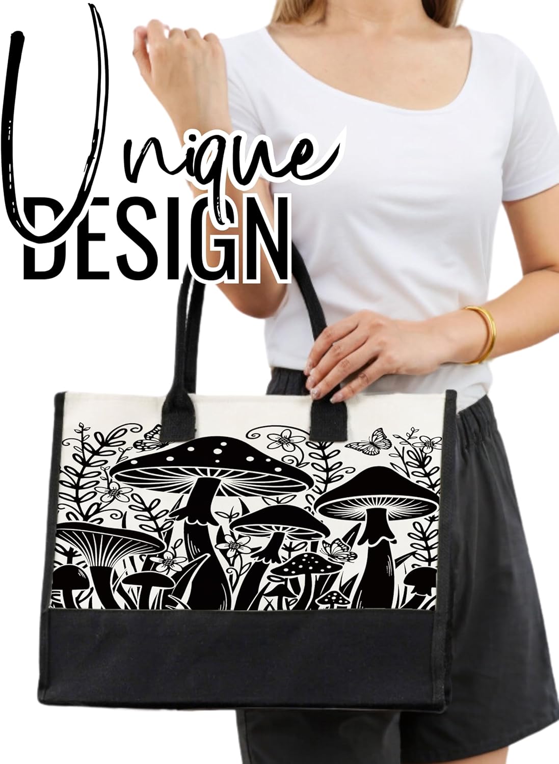 InnoBeta Mushroom Gifts for Women Canvas Tote Bag, Mushroom Decor, Mushroom Gifts Tote with Top Zipper Closure and Shoulder Strap for Birthday, Mother's Day, Christmas - Black