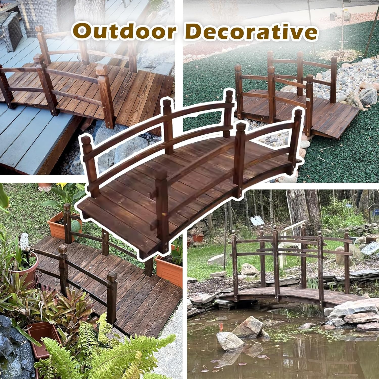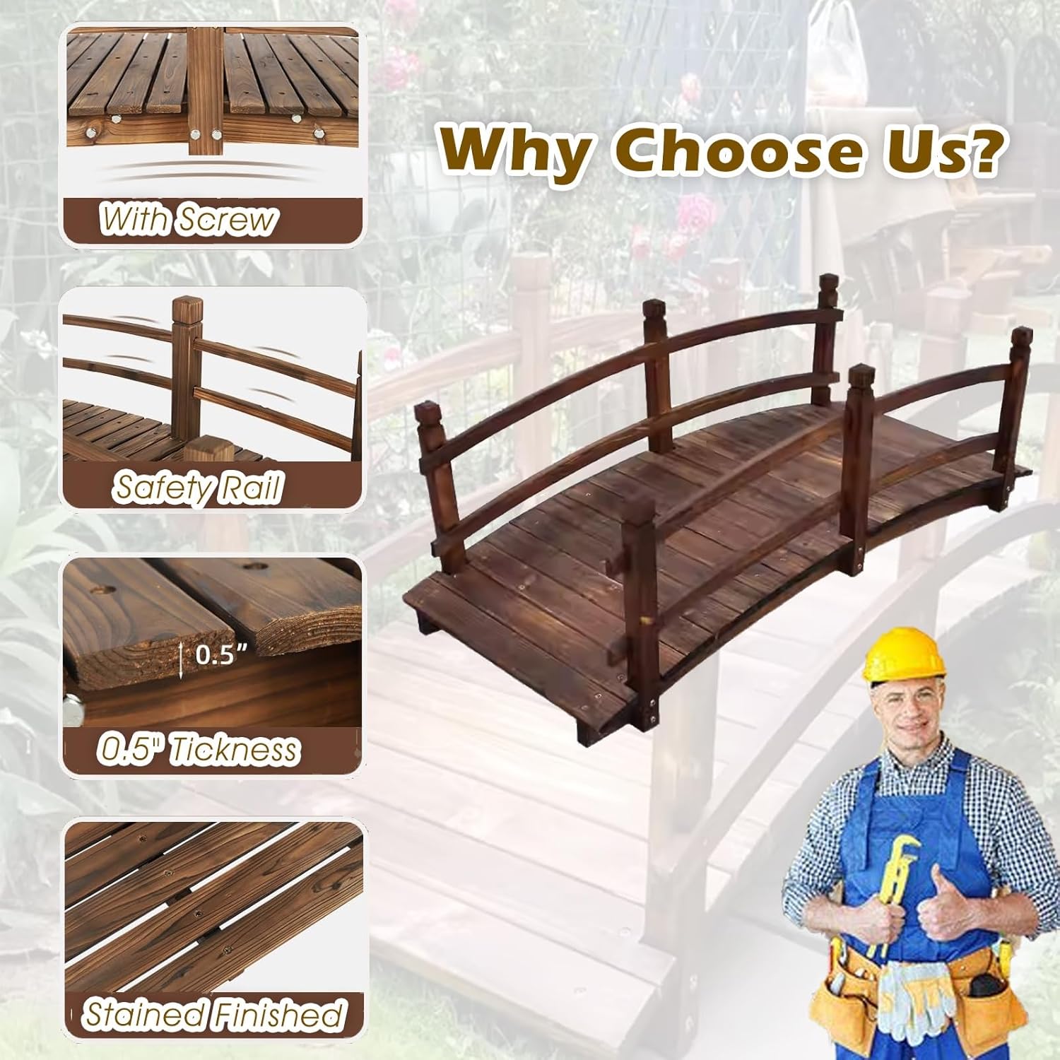 Looking for a garden addition that combines exquisite craftsmanship with practicality?Your bare feet meet 0.5-inch carbonized pine, its 881lb strength cradling children’s racing steps as the family golden retriever bounds across. Leaning against handrails you stained cedar-red last weekend, watch koi dart beneath arches where dawn ignites your DIY masterpiece.Specifications:Color: Natural/BrownMaterial: pine woodProduct Size: 4.6ft, 5ft, 6ftWood Thickness of Bridge Supporter:1.2"Wood Thickness of Arms: 2.2"Weight Capacity: 661lbs-881lbsFeature:Perfect decoration for gardens, farms, ponds, streams, etcDouble-sided railings, safe and beautifulThe bottom reinforcement design can hold 881 poundsMounting accessories are included for quick assemblyEnhance the aesthetics of garden walkwaysClassic and beautiful arched frame designCurved sidebar, elegant and safeNaturally anti-cracking and anti-splittingCarbonization ensures long-term outdoor usePackage List: 1 x Garden Bridge1 x glovePlease Note:Small scars or cracks on the surface is normal for natural wood.Use the gloves for handling boards as they are not wiped off well from stainingPut boiled linseed oil on it to help it last longer