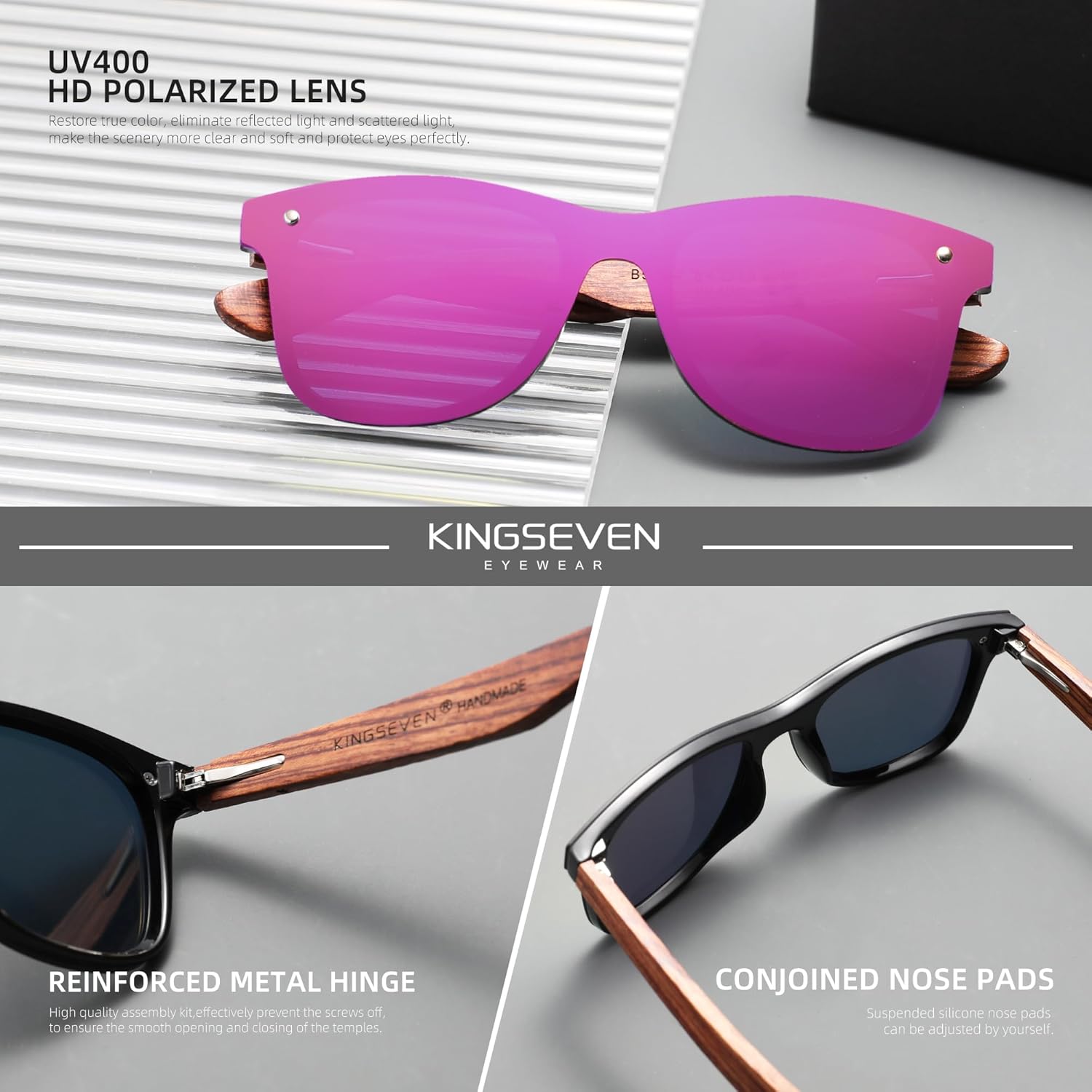 KINGSEVEN Wooden Sunglasses - Polarized UV 400 Protection Mirrored Lenses B-5504 Elevate your style and protect your eyes with the KINGSEVEN Wooden Sunglasses, expertly crafted for both men and women. Featuring a unique Bubinga wood frame, these sunglasses combine elegance and durability, making them a perfect accessory for any occasion. Designed with polarized lenses, our sunglasses provide superior glare reduction, ensuring crystal-clear vision whether you're at the beach, driving, or enjoying outdoor activities. The UV 400 Protection shields your eyes from harmful rays, giving you peace of mind while you soak up the sun. The mirrored lenses not only add a touch of modern sophistication but also enhance your visual experience by reducing brightness and improving clarity. Lightweight and comfortable, these wooden sunglasses are ideal for all-day wear. Whether you're shopping for mens sunglasses polarized or stylish sunglasses for women, the KINGSEVEN Wooden Sunglasses B-5504 offer the perfect blend of functionality and fashion. Make a statement while keeping your eyes safe.