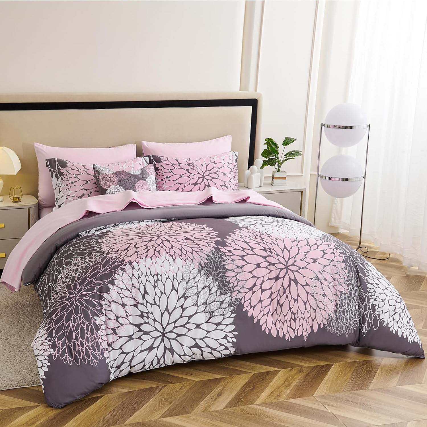 Bring bold elegance to your bedroom with this black and pink floral comforter set. Made from soft microfiber, it includes 1 comforter and 2 pillow shams with a reversible design for versatile style. Featuring a chrysanthemum-inspired print in white, pink, and black, this comforter adds charm to any spaceโwhether it's a girl's room, dorm, or master bedroom. Lightweight yet warm, it's perfect for all seasons. Easy to care for and vacuum-packed for shipping, this set fluffs up beautifully with a little sun and patting. Ideal for teen girls, women, or anyone who loves a statement bed set.