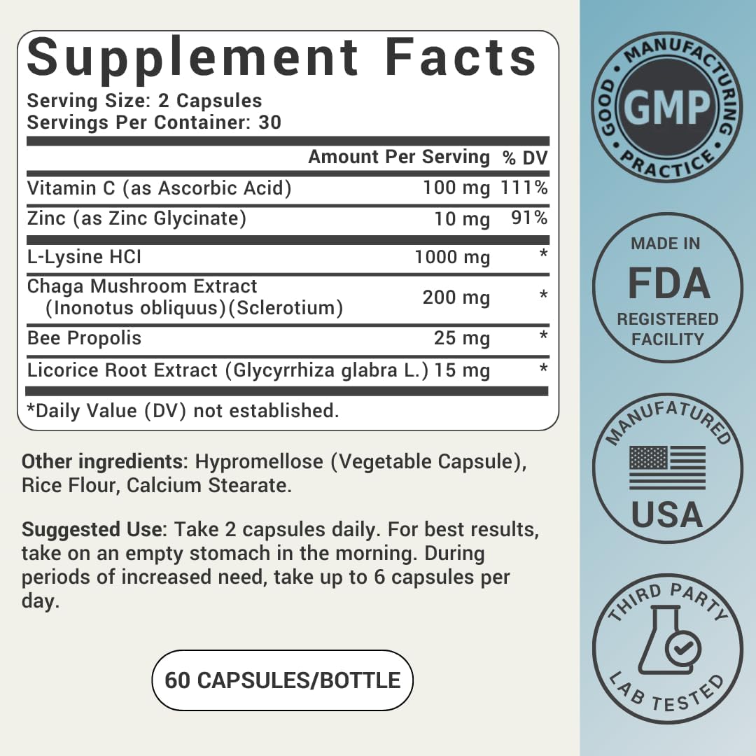| Special Ingredients | Chaga Mushroom, L-Lysine |