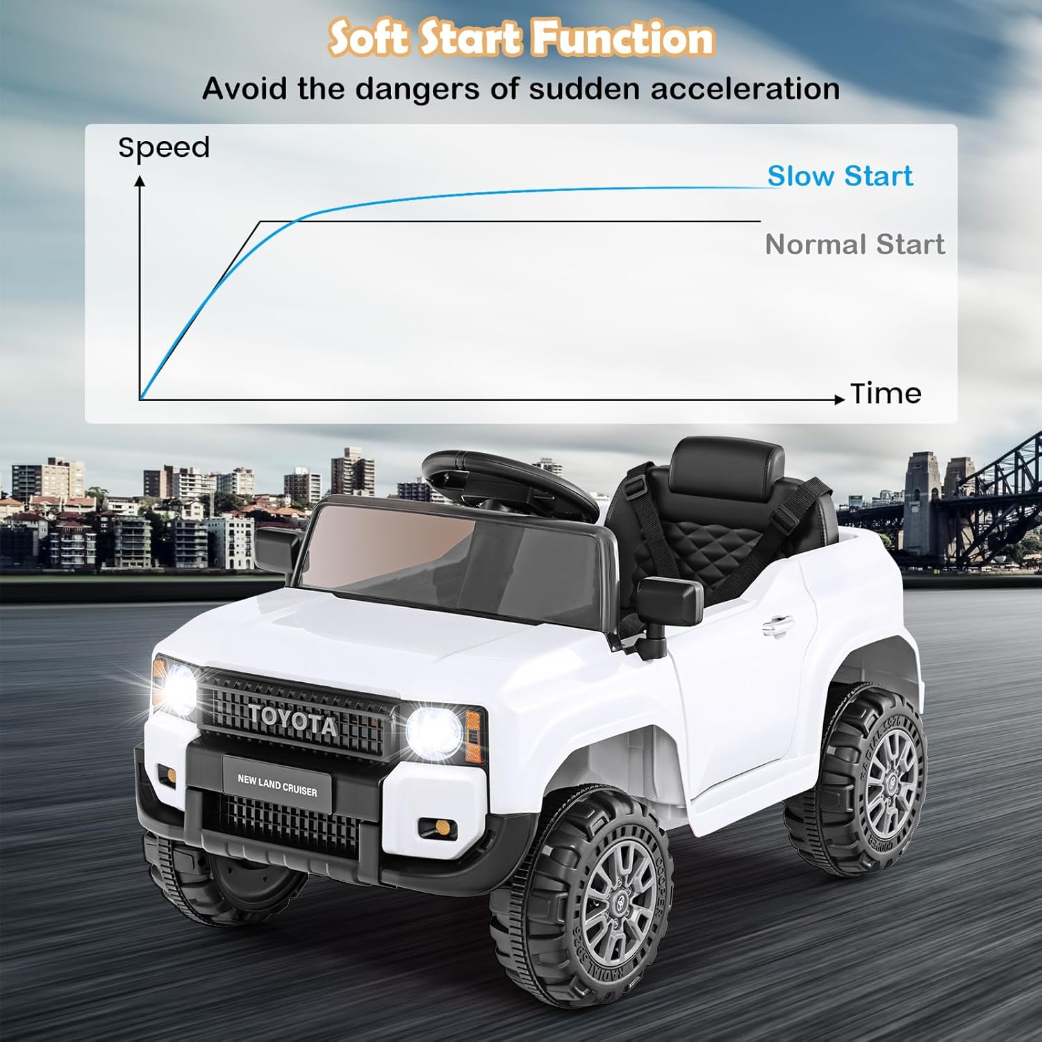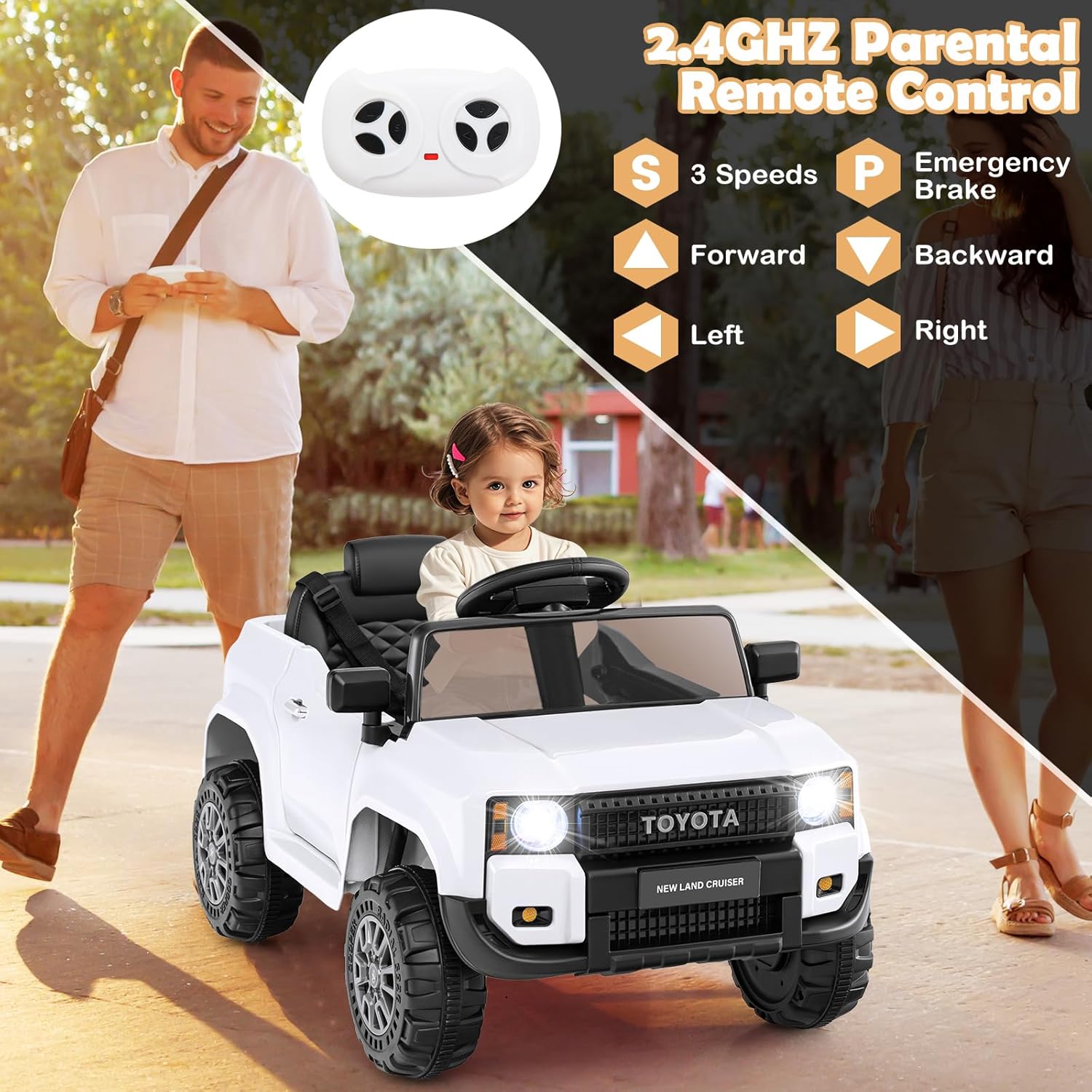 Why do you choose INFANS ride on car for kids? The 12V Toyota ride on car has outstanding quality and design, and we are committed to the pursuit of detail and exquisite design to make the vehicle look more realistic, giving children the closest driving experience to the reality. In addition, the design focus on the safety of children, so the electric car is equipped with seat belt to ensure that children feel safe during the ride. The truck use a soft start function and non-slip tires, so that can remain stable in all road conditions. We believe that choosing this toy car will bring joy and fun to kids and be part of their healthy growth.Features: 12V 7AH batteries provide more powerful performance and longer battery life USB, MP3 and built-in music function enrich baby's driving experience The shock absorption of 4 wheels ensures smooth driving 3 speeds can be adjusted by remote Slow start and brake avoid being frightened by sudden acceleration or braking Give child a perfect riding experience like a real car, fully experience Wear resistant wheels for riding on grass, wood, rubber tracks or brick Suitable for children 3+ years oldSpecification: Color: Black, White, Pink, Blue Material: PP, Metal Battery: 12V 7AH Speed: 2.42-2.98-3.67 Mph Motor: 2 x 65 W Net Weight: 24.5 Lbs Play Time: 45 Hours Charging Time: 8-12 Hours Weight Capacity: 110 Lbs Suitable Age: 3+ Years Size of Seat: 12.5” x 7.5” x 8”(L x W x H) Overall Dimension: 34.5” x 21.5” x 19.5” (L x W x H) Package includes: 1 x Remote Control 1 x Charger 1 x Instruction 1 x Ride on Car