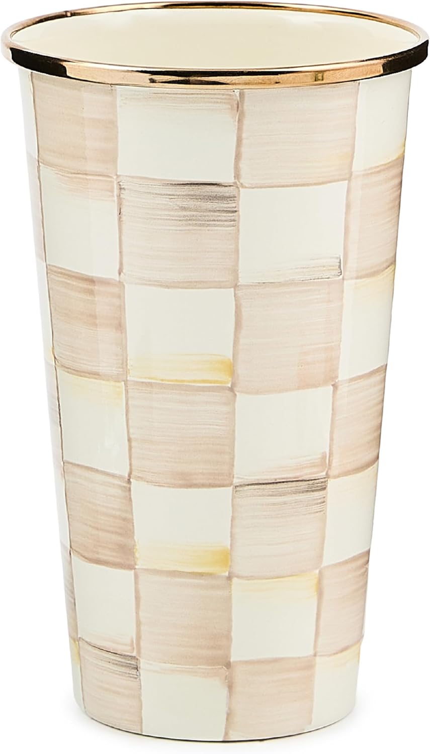The MacKenzie-Childs Enamel Tumbler lets you drink in style. Made with plenty of function and style, it serves smoothies, refreshing mixers, or iced coffee in an elegant way. Add one to the powder room, a pair on your bedside tables, and a stack in the kitchen so this charming cup is always within reach. It’s durable enough to travel and take camping and looks pristine next to the other glasses in your cabinet.Our reusable tumbler pairs well with the other kitchen tools and dishware in our signature collections, including tea kettles, enamel cookware, bakeware, serving dishes, plates, and more! The simple elegance of the pattern also makes it part of a practical gift set with a matching pitcher and our Rattan Tray.You’ll never have to guess what to get for a housewarming gift now that you’re a part of the MacKenzie-Childs family. Our artisan-designed home decor is the perfect gift for any special person in your life. Since 1983, our talented designers and artisans have created beautiful original tableware, furniture, home and garden accessories, and more that add joy and grace to homes great and small throughout the world.Care instructions: For best results, hand-wash with mild soap and dry immediately. Do not microwave. Use caution with hot liquids. Materials: Hand-glazed heavy-gauge steel underbody with a hand-painted pattern rimmed in bronzed stainless steel. Pieces may vary due to the handmade nature of each product. Imported. Our enamelware exceeds both federal food-safety regulations and California’s Proposition 65, the strictest environmental safety standards in the United States. Handle enamelware with care and discontinue use for food service if it becomes chipped, cracked, or broken.