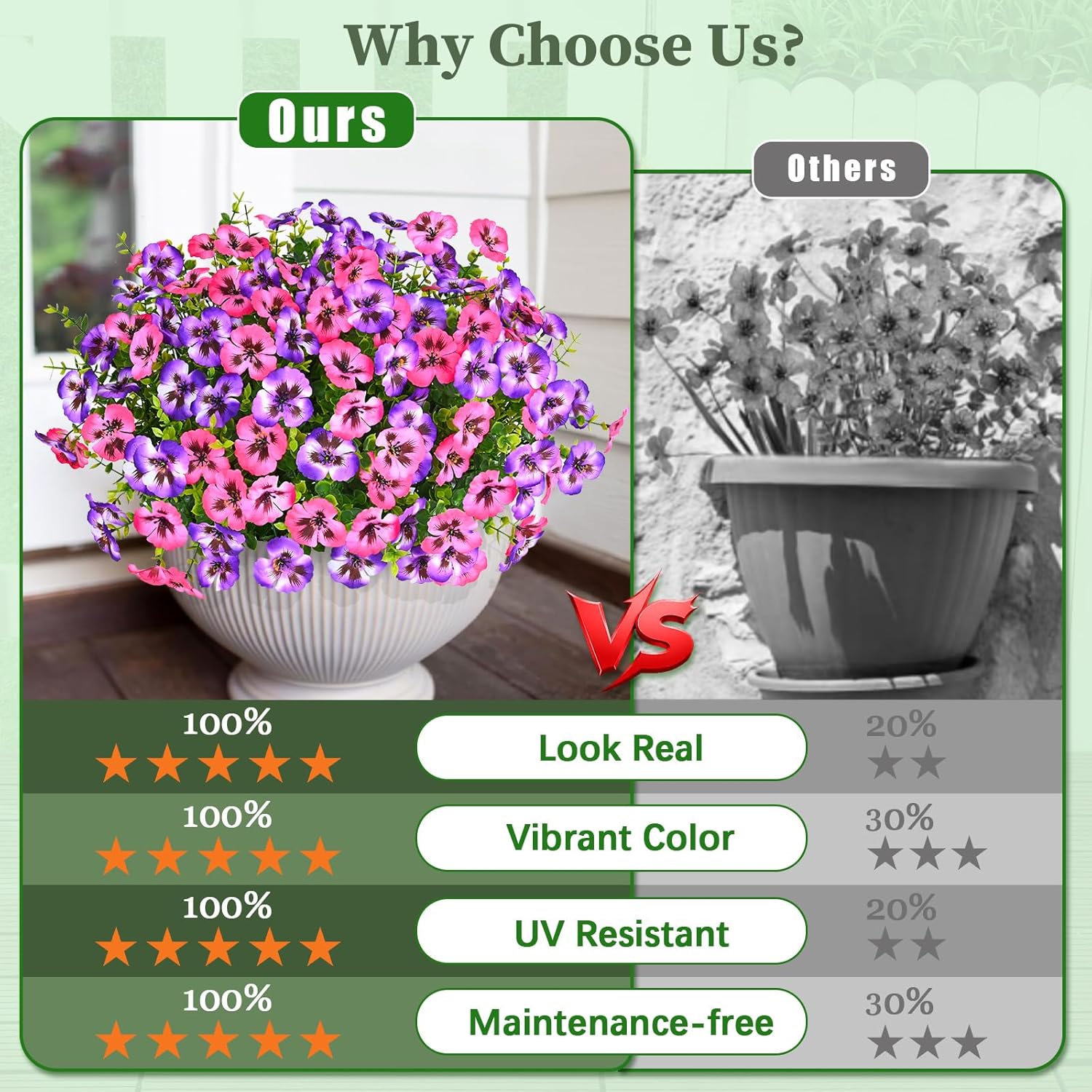 Turn your outdoor space into a year-round floral paradise with our UV-resistant faux silk pansies flowers. Enjoy the beauty of flawless blooms without the hassle of maintenance. Add to your cart today and bring vibrant, everlasting elegance to your home!Artificial Flowers for Outdoors Specifications: Material: Plastic and silk Color: Pink+Purple Size: approx. 14.5 inch in length (each) Artificial Flowers for Outdoors Features: Premium Quality: Crafted from high-quality materials, these silk pansies flowers are both durable and incredibly lifelike. Treated with UV-resistant technology, they retain their vibrant colors season after season, ensuring long-lasting beauty. Colorful Diversity: Available in five stunning colors, these artificial flowers for outdoors allow you to create the perfect natural ambiance. Ideal for gardens, balconies, patios, or any outdoor space in need of a floral upgrade. Lifelike and Natural: The combination of pansies blooms and eucalyptus leaves captures the essence of nature, offering a realistic touch that seamlessly blends with your existing outdoor decor. Maintenance-free: Enjoy the beauty of flowers without the work! These fake hanging flowers require no watering, fertilizing, or pruning, making them perfect for busy homeowners who want continuous charm with zero effort.Package Included: 18 x Artificial Flowers for Outdoors 1 x Brand manualWarranty: As a trusted brand in outdoor artificial flowers, we are committed to bringing life and energy to your home. Your satisfaction is our top priority. If you have any questions or concerns, please don’t hesitate to contact us. We’ll respond promptly and do our best to resolve any issues.Warm Notice: Due to long-distance shipping, there may be a slight odor when you first open the package. This is normal and will dissipate after a few days in a well-ventilated area. Please note that manual measurements may result in slight size variations, and colors may appear slightly different due to lighting and camera settings. We appreciate your understanding.