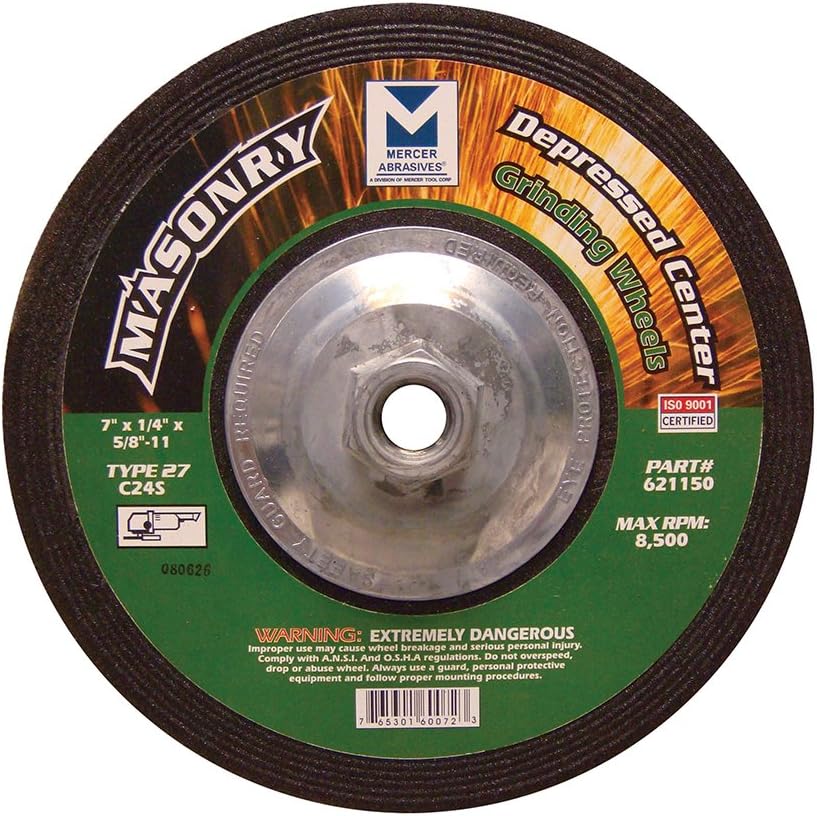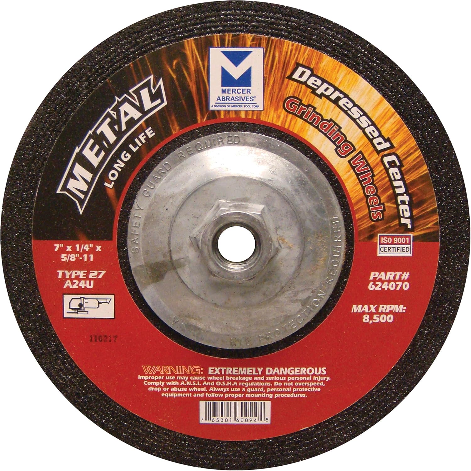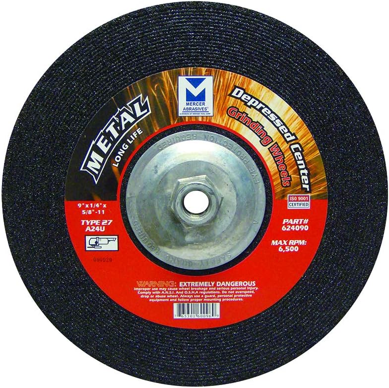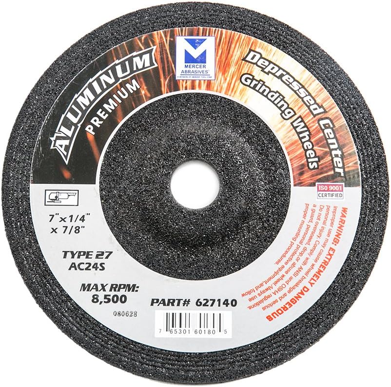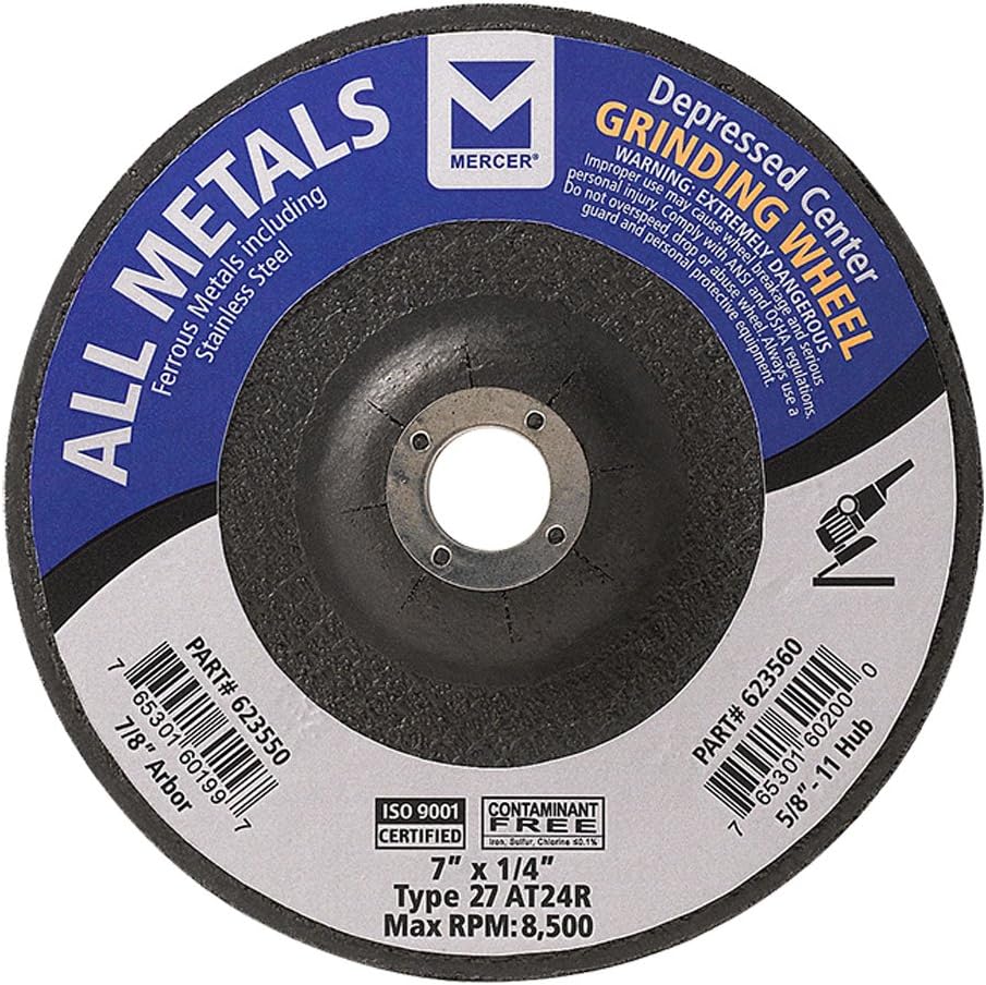 The Mercer Industries type 27 Depressed center general Purpose grinding wheel for metal is made with aluminum Oxide grain to grind ferrous metals. Internally reinforced for safety and strength. Wheel is balanced to avoid vibrations. Available in 4", 4-1/2", 5", 6", 7" and 9" diameters with a 5/8", 7/8" or 5/8"-11 Arbor to fit all angle grinders.