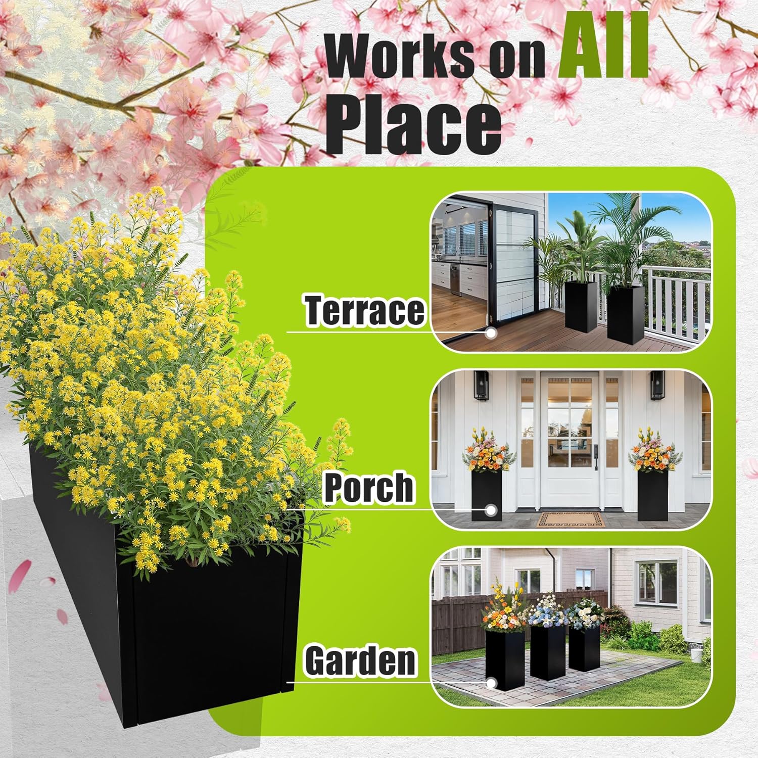 Metal Planter Box 30" x 12" x 16" Large Rectangular Planter Heavy Duty Galvanized Steel Tall Plant Boxes with Insert Shelf and Drainage Holes for Outdoor Patio Yard Garden Porch TerraceSpecifications:Material: MetalDimensions: 30"L x 12" W x 16"HColor: BlackStyle: ModernWeight: 31.53 lbsMounting Type: Floor StandingAdaptation: Indoor and outdoor, patio, yard, gardens, courtyards, terraces, front corridors, porch, hotel and living roomsFeatures:This Fsehyue high rectangular metal flowerpot is made of premium galvanized steel and coated with a black powder coating, providing excellent weather resistance and UV protection.The flower box is designed with a detachable insertion partition, allowing users to freely choose whether to place the partition according to the height of the plants, meeting the needs of different seasons and plant species.The flower pot is equipped with multiple drainage holes, effectively avoid waterlogging, maintain soil ventilation, and ensure the health of plant roots. The installation process is simple and only requires minimal time and effort to add durable decoration to your porch or terrace.Its black smooth metal finish is not only beautiful and elegant, but also easily blends into various environments such as indoor and outdoor, gardens, courtyards, terraces, front corridors, and living rooms.