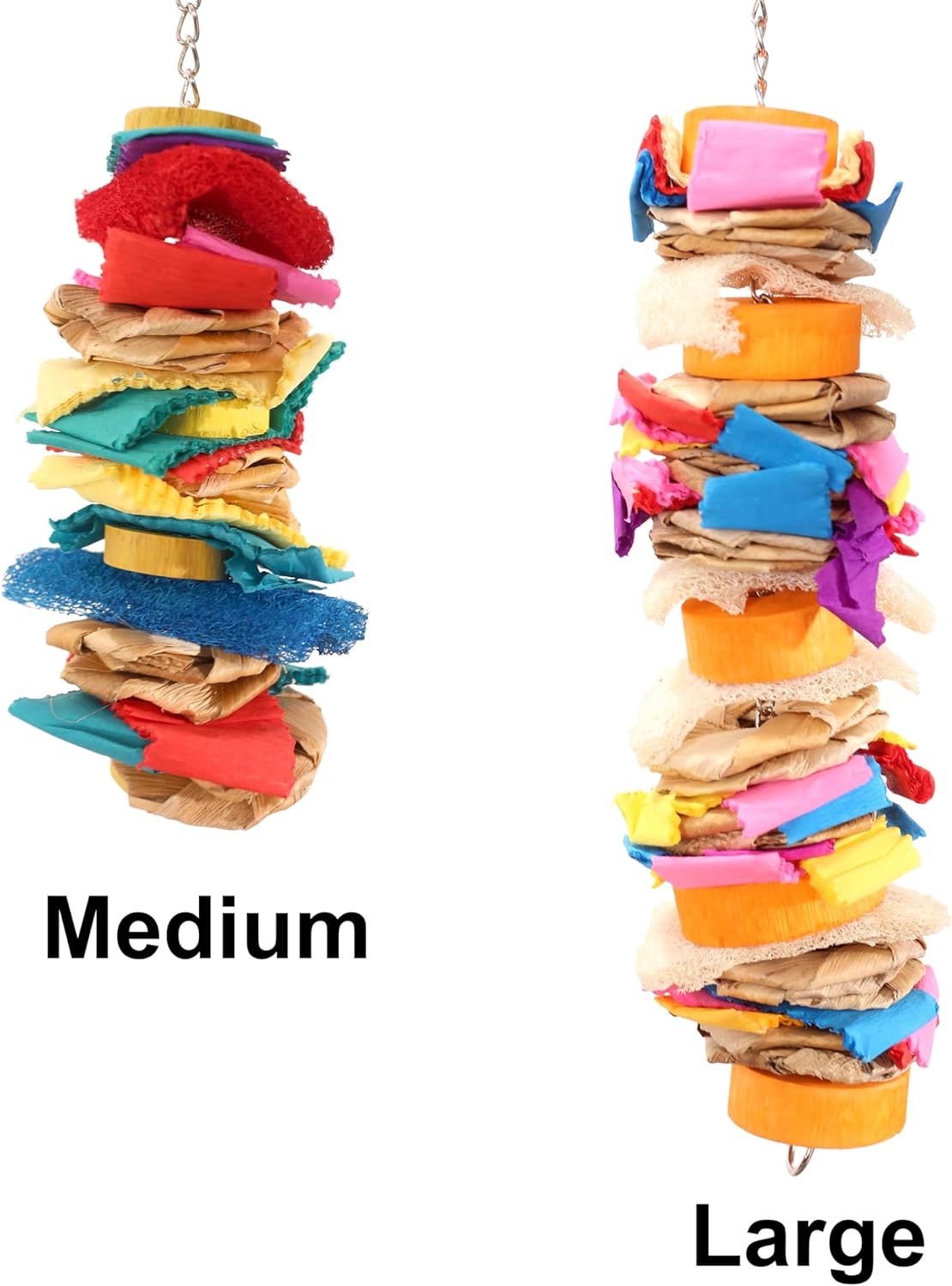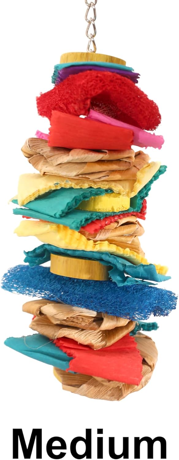 The Loofah Drizzle shreddable parrot toy is a fun weave of various soft shreddable materials for your parrot to explore. Especially great for parrots that aren't big on chewing wood, young birds, small birds, and just for variety. This toy features natural chewable Loofah from the fruit of the Luffa plant. It also has natural woven palm, paper, and wood. Lots of chewing, shredding, and destructive fun for parrots of all types and sizes. Hide treats in the loofah for extra foraging incentive. The Loofah Drizzle comes in two sizes: Medium 11" - Cockatiel, Quaker, Ringneck, Caique, Conure, Senegal, Pionus, Hahns Macaw Large 19" - African Grey, Eclectus, Amazon, Cockatoo, Macaw *colors may vary