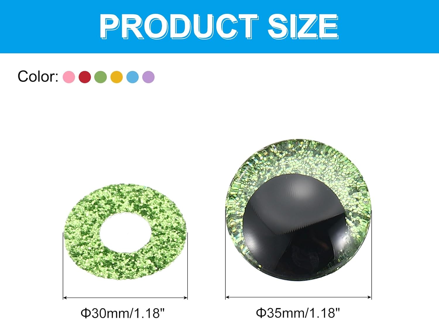 These Flash Safety Eyes are suitable for doll making, crafts making, toy sewing, DIY decorations, food decoration, and other uses.SpecificationSize:35mm/1.38 inch ;Color: Pink, plum red, gold, grass green, blue, purple;Sequins Size: 30mm/1.18 inch ;Material: Plastic;Packing List: 24 35mm Flash Safety Eyes in total, 4 sets for each of the 6 colors.AdvantageThese Flash Safety Eyes are made of Plastic material, and the details of the eyeballs make them three-dimensional, full, deep, and lifelike. Surface covered with protective, film is not easy to scratch.InstructionThese well-made eyeballs are brightly colored and available in a variety of colors, giving the doll Craft lifelike eyes.NotePlease make sure that the size of the doll or other item that requires eyeballs is suitable for the size of the eyeballs.The current gaskets are either round or flat, and will be uniformly changed to flat later.